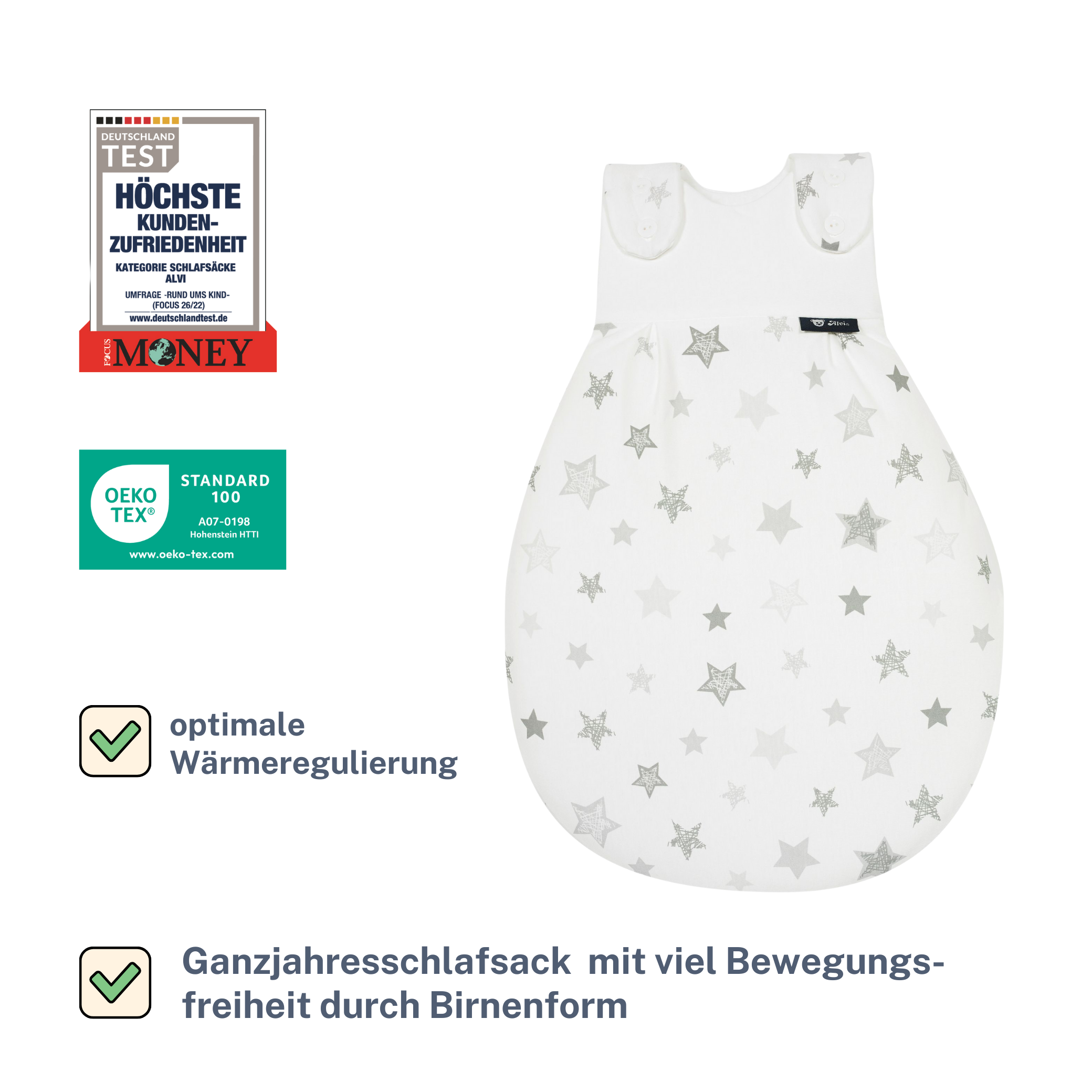 bietet viel Strampelfreiheit durch Birnenform und garantiert eine sichere Schlaf-und Liegeposition