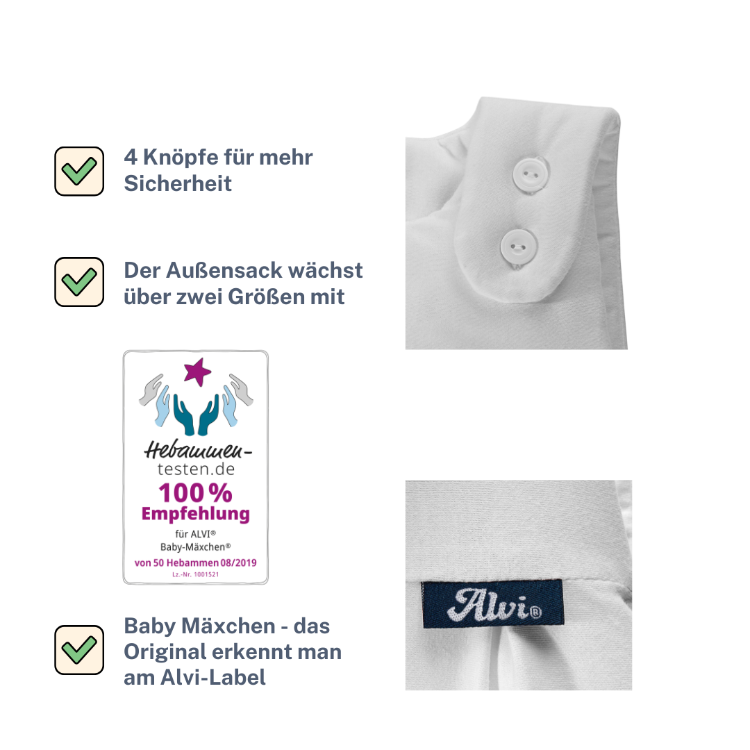 Der hübsche Alvi Baby-Mäxchen Außensackaus weichem Baumwoll-Jersey bietet viel Strampelfreiheit. Er ist birnenförmig und wächst dank variablem Knopfsystem mit. Der Außensack ist leicht wattiert und ermöglicht mit umlaufendem Reißverschluss ein schnelles Wickeln in der Nacht. Der tolle Schlafsack wurde von Experten entwickelt und sorgt für einen sicheren und gesunden Babyschlaf.
