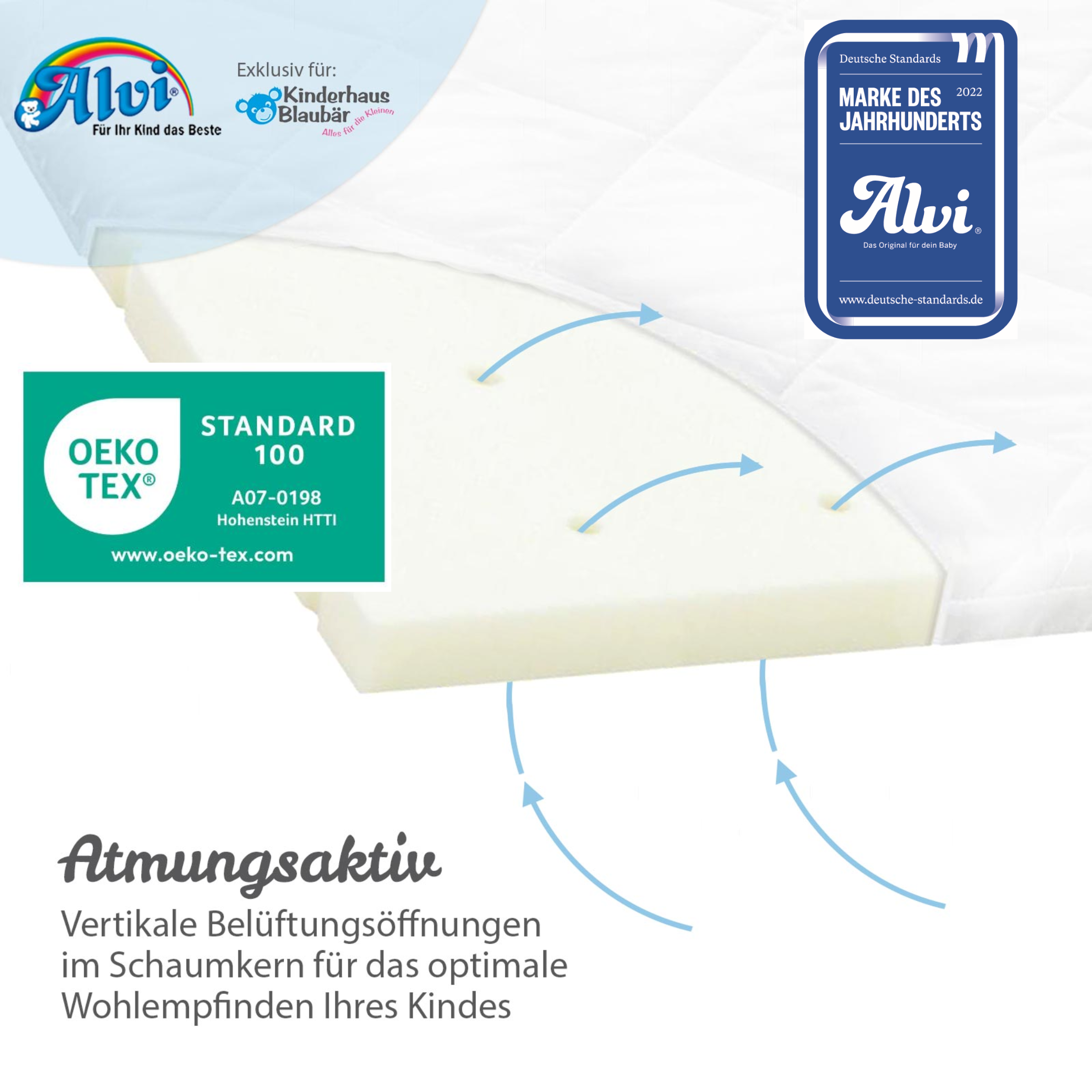 Die Alvi Matratze Alvimed Air überzeugt mit höchstem Schlafkomfort und durchdachter Klimaregulierung – perfekt für ein gesundes, hygienisches Schlafumfeld. Der 40 mm starke Schaumkern mit vertikalen Klimakanälen sorgt für eine optimale Luftzirkulation und ein angenehm trockenes Schlafklima – ideal, um Wärmestau und Feuchtigkeit zuverlässig zu vermeiden. Der hochwertige Tencel & Dry Bezug begeistert durch seine besondere Materialkombination: Er ist antiallergisch, hautsympathisch und bietet ein herausragendes Feuchtigkeitsmanagement. Dank der innovativen Tencel-Faser ist der Bezug sanft wie Seide, kühl wie Leinen und warm wie Wolle – perfekt für jede Jahreszeit. Zudem ist er waschbar bis 60°C, was höchste Hygiene und Frische garantiert. Mit einem Bezug aus 100% biologischen, schnell nachwachsenden Rohstoffen setzt die Alvimed Air Matratze auch in puncto Nachhaltigkeit neue Maßstäbe. Das Material besteht aus 66% Polyester und 34% Lyocell (Tencel), versteppt mit 100% Polyester-Hochbauschvlies, während die Unterseite aus 100% Baumwolle gefertigt ist – für ein natürliches, angenehmes Liegegefühl. Im Angebot enthalten ist eine kuschelige Baumwoll-Windel 100% Baumwolle.