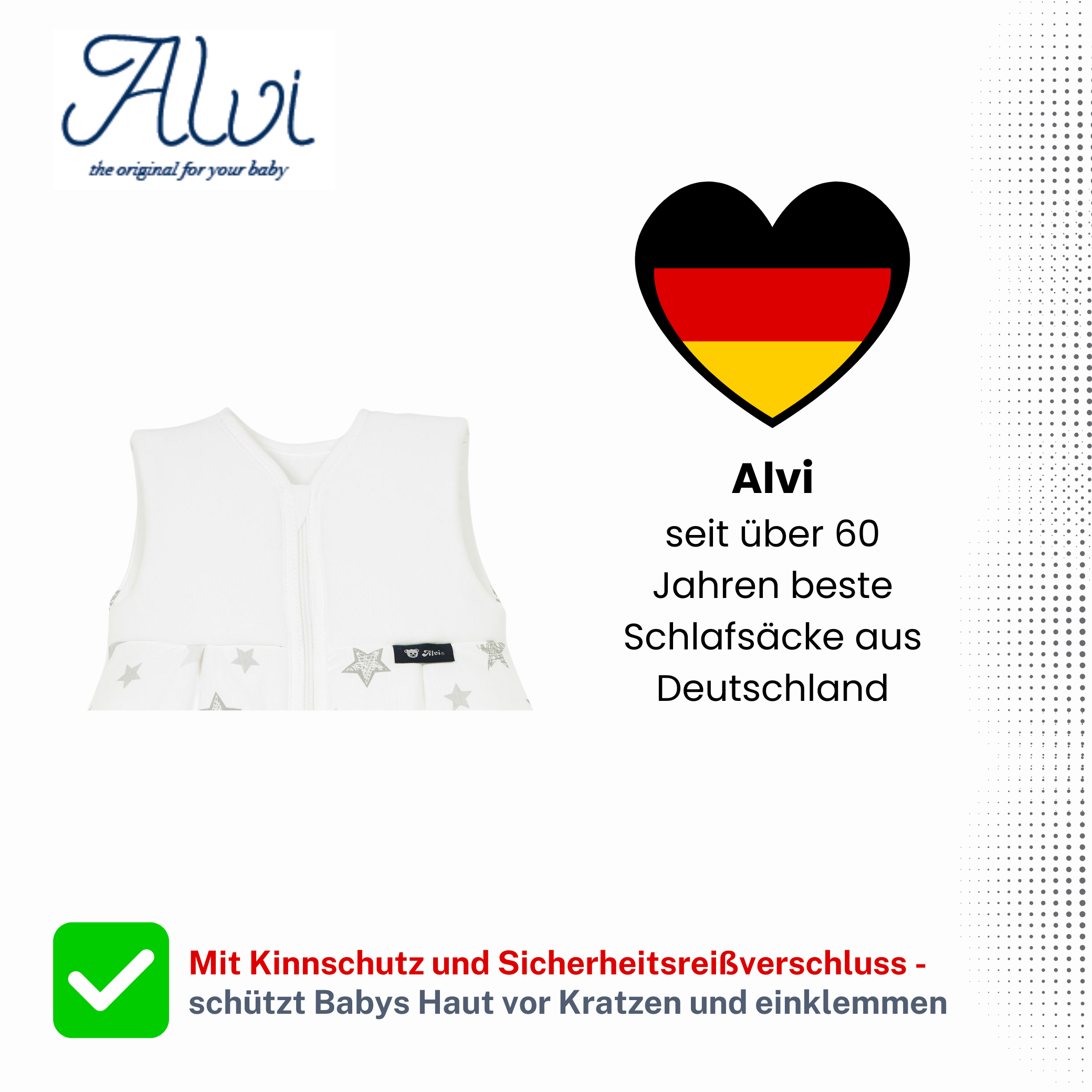 Der Thermo-Kugelschlafsack von Alvi ist außen angenehm weich und verfügt über einen extra langen Reißverschluss. Das Innenmaterial besteht aus kuschelweicher Wattevliesfüllung, die Ihrem Kind ein Gefühl von Geborgenheit gibt. Der Thermo-Kugelschlafsack ist für die kalten Tage optimal geeignet. ALVI - Der Baby-Schlafexperte Seit über 50 Jahren engagiert sich Alvi dafür, dass die Allerkleinsten die bestmögliche Schlafumgebung bekommen. Dafür entwickelt Alvi innovative Matratzenkerne, hochfunktionale Bezüge und unvergleichliche Schlafsäcke. Produkte von Alvi bieten ein optimales Schlafvergnügen von Anfang an. Der Alvi Schlafsack Mäxchen Thermo ist ein kuscheliger Ganzjahres-Schlafsack. Er garantiert Ihrem kleinen Liebling sowohl im Sommer als auch im Winter einen sicheren und wohlbehüteten Schlaf. Der Schlafsack Mäxchen Thermo aus kuscheligem Baumwoll-Jersey wärmt optimal und bietet viel Strampelfreiheit. Die breite Größenspanne bietet Babys und auch größeren Kindern diesen nächtlichen Wärmeschutz. Durch den mittigen Komfort-Sicherheits-Reißverschluss lässt er sich einfach öffnen. Der Schlafsack kann für eine optimale Hygiene bei bis zu 60° Celsius gewaschen werden. Der Trikotschlafsack besteht zu 100 Prozent aus gekämmter Baumwolle.