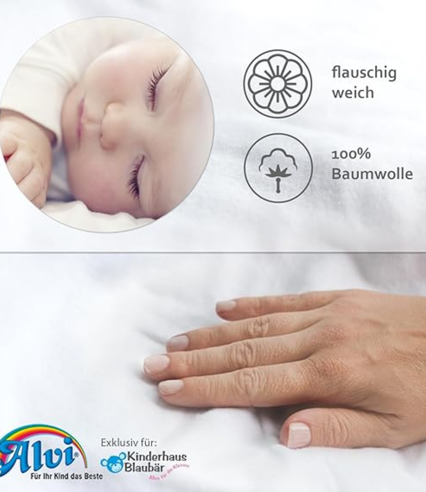 Der Thermo-Kugelschlafsack von Alvi ist außen angenehm weich und verfügt über einen extra langen Reißverschluss. Das Innenmaterial besteht aus kuschelweicher Wattevliesfüllung, die Ihrem Kind ein Gefühl von Geborgenheit gibt. Der Thermo-Kugelschlafsack ist für die kalten Tage optimal geeignet. ALVI - Der Baby-Schlafexperte Seit über 50 Jahren engagiert sich Alvi dafür, dass die Allerkleinsten die bestmögliche Schlafumgebung bekommen. Dafür entwickelt Alvi innovative Matratzenkerne, hochfunktionale Bezüge und unvergleichliche Schlafsäcke. Produkte von Alvi bieten ein optimales Schlafvergnügen von Anfang an. Der Alvi Schlafsack Mäxchen Thermo ist ein kuscheliger Ganzjahres-Schlafsack. Er garantiert Ihrem kleinen Liebling sowohl im Sommer als auch im Winter einen sicheren und wohlbehüteten Schlaf. Der Schlafsack Mäxchen Thermo aus kuscheligem Baumwoll-Jersey wärmt optimal und bietet viel Strampelfreiheit. Die breite Größenspanne bietet Babys und auch größeren Kindern diesen nächtlichen Wärmeschutz. Durch den mittigen Komfort-Sicherheits-Reißverschluss lässt er sich einfach öffnen. Der Schlafsack kann für eine optimale Hygiene bei bis zu 60° Celsius gewaschen werden. Der Trikotschlafsack besteht zu 100 Prozent aus gekämmter Baumwolle.