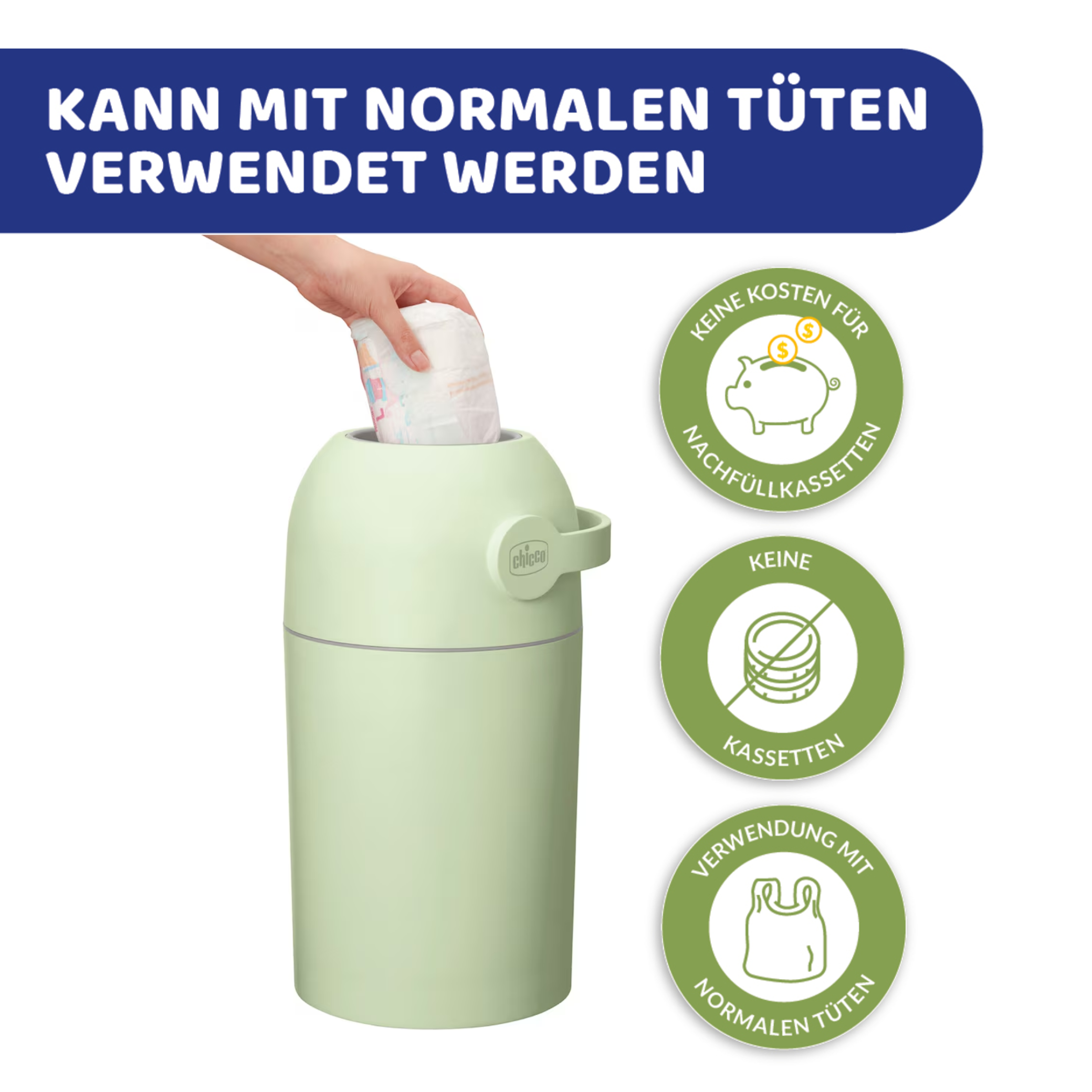 Dieser Windeleimer von Chicco funktioniert mit normalen Müllbeuteln, so dass keine zusätzlichen Kosten für Nachfüllkassetten anfallen. Praktisch und einfach: Mit nur einer Hand ist die Windel, in drei schnellen Schritten entsorgt. Trotz seiner kompakten, platzsparenden Maße bietet der Windeleimer ein großes Fassungsvermögen für bis zu 25 Windeln. Innovative Dichtungen verhindern zudem den Austritt von unangenehmen Gerüchen. Im Angebot enthalten ist eine kuschelige Baumwoll-Windel aus 100% Baumwolle.