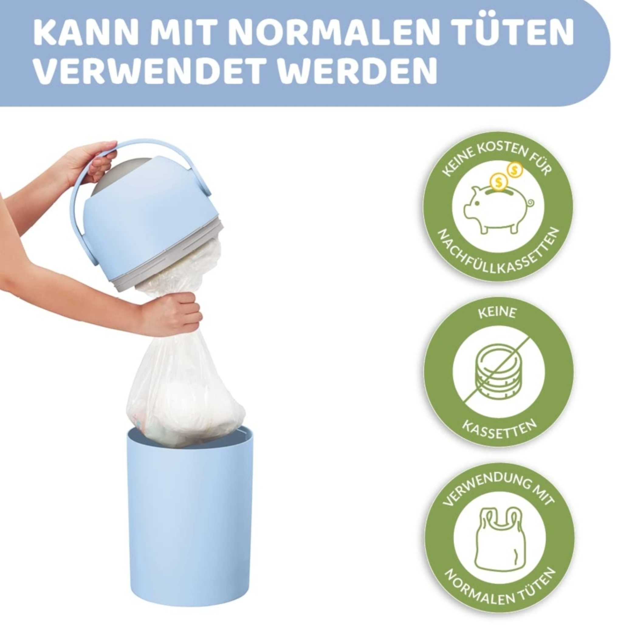 - Mit normalen Müllbeuteln verwendbar