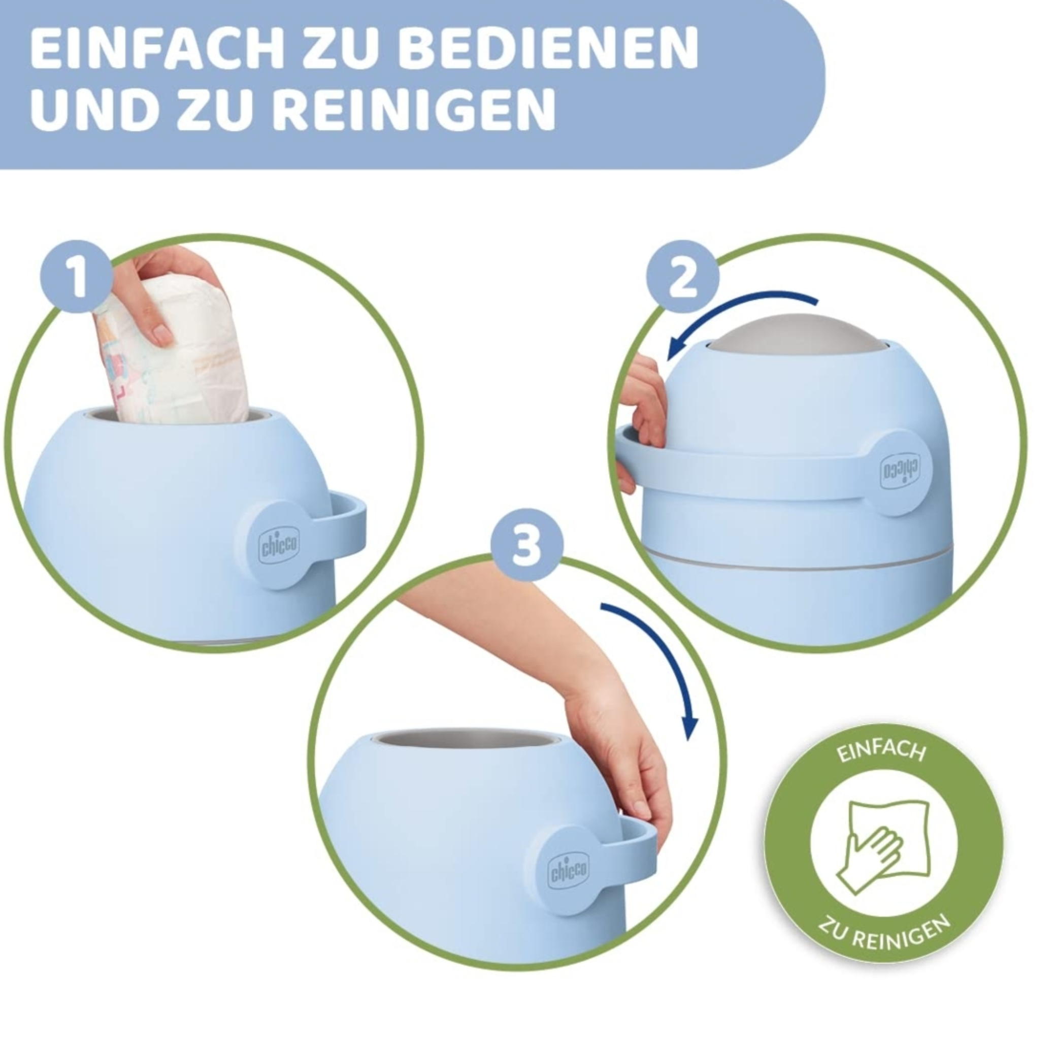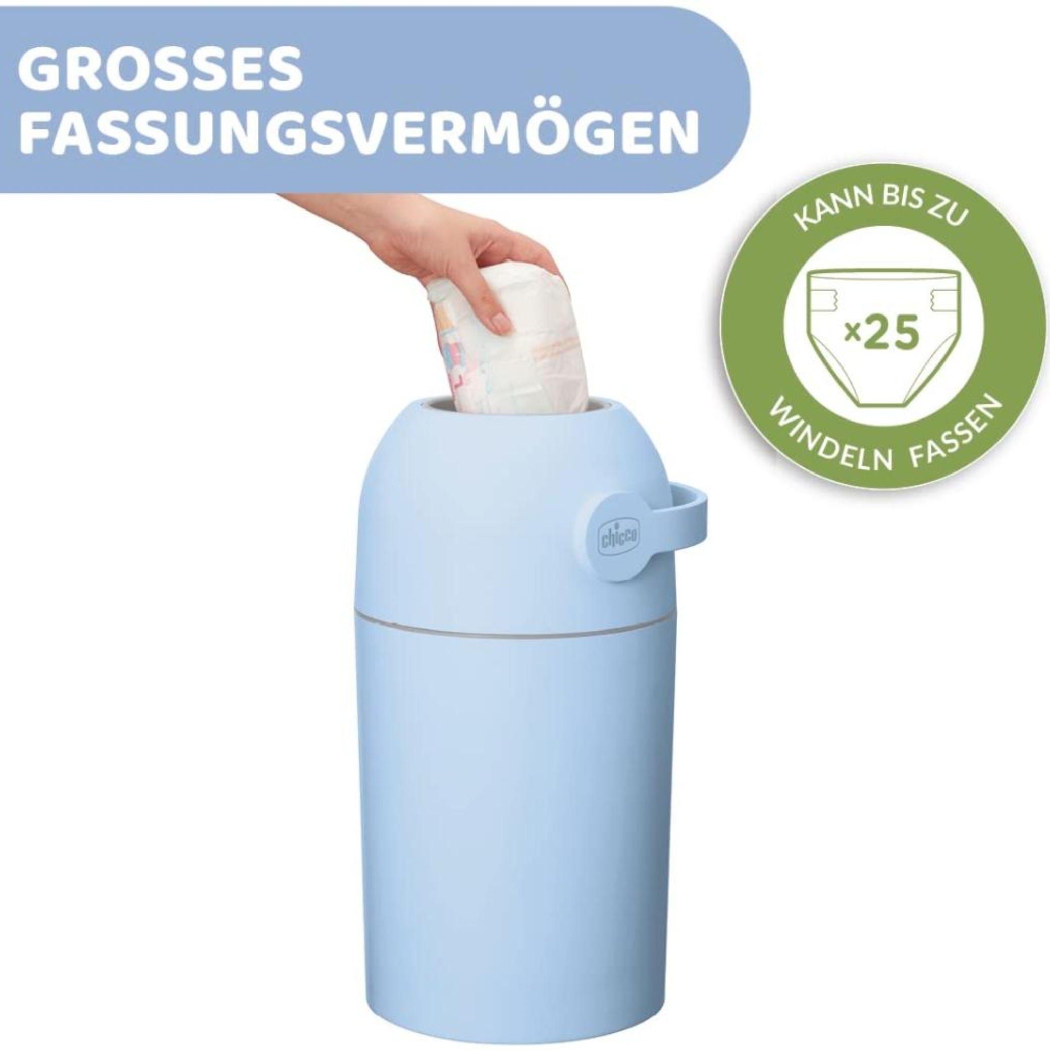 Dieser Windeleimer von Chicco funktioniert mit normalen Müllbeuteln, so dass keine zusätzlichen Kosten für Nachfüllkassetten anfallen. Praktisch und einfach: Mit nur einer Hand ist die Windel, in drei schnellen Schritten entsorgt. Trotz seiner kompakten, platzsparenden Maße bietet der Windeleimer ein großes Fassungsvermögen für bis zu 25 Windeln. Innovative Dichtungen verhindern zudem den Austritt von unangenehmen Gerüchen. Im Angebot enthalten ist eine kuschelige Baumwoll-Windel aus 100% Baumwolle.