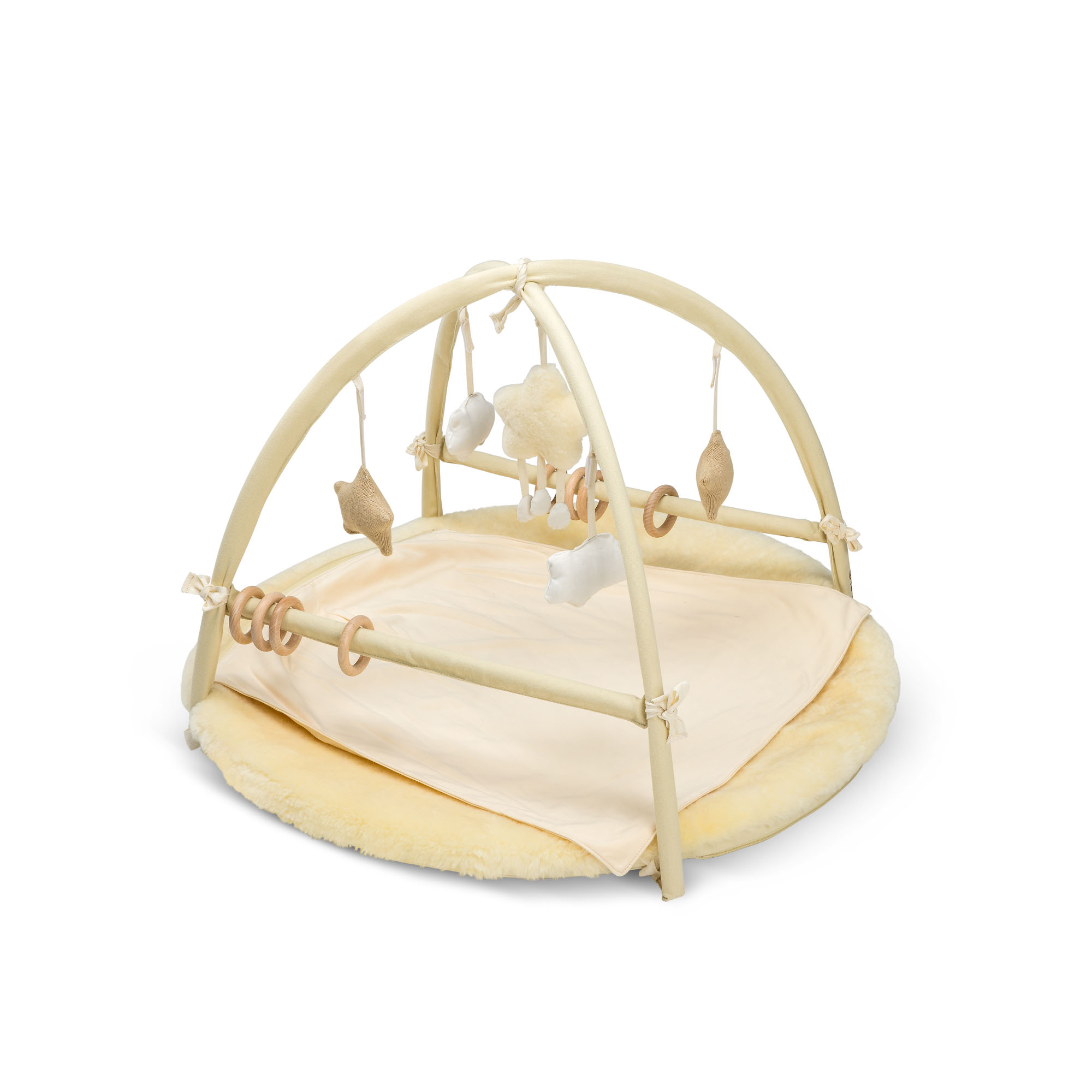 Das Fellhof Activity Center Stella kombiniert liebevoll handgefertigte Materialien mit durchdachtem Design, um Ihrem Baby eine behagliche und gleichzeitig spannende Welt der Entfaltung zu bieten. Der ideale Begleiter für die ersten Monate, wenn es darum geht, die Sinne Ihres Babys spielerisch zu fördern und dabei höchsten Komfort zu gewährleisten. Das Activity Center verfügt über ein herausnehmbares Schaumstoffkissen, das für eine angenehme Polsterung sorgt und Ihrem Baby eine weiche Unterlage zum Spielen bietet. Zusätzlich können Sie die verstaubare und abzippbare Baumwolldecke individuell anpassen, je nach Bedarf und Wetterlage. Die abnehmbaren Anhänger aus Merinowolle, Lammfell und Baumwolle sind mit Kapok- und Baumwollfüllung versehen und regen die Sinne Ihres Babys mit unterschiedlichen Texturen an. Besonders faszinierend sind die kleinen Details: 3 Sterne und 2 Wolken sorgen für einen liebevollen Blickfang, während 8 Ringe aus naturbelassenem Buchenholz zum Greifen und Spielen einladen Dank des praktischen, abnehmbaren Bezugs – der bei 30 °C im Schonwaschgang mit Spezialshampoo gewaschen werden kann – bleibt das Activity Center stets hygienisch und pflegeleicht. Die Oberseite des Centers besteht zu 100% aus hochwertigem Merino-Lammfell, das für seine weiche, atmungsaktive und temperaturausgleichende Wirkung bekannt ist, während die Unterseite aus 100% Baumwolle besonders sanft zur empfindlichen Haut Ihres Babys ist. Das Fellhof Activity Center Stella hat einen Durchmesser von 85 cm und eine Höhe von 55 cm, wodurch es ausreichend Platz für vielfältige Spielmöglichkeiten bietet. Im Angebot enthalten ist ein kuscheliges Mulltuch aus 100% Baumwolle.