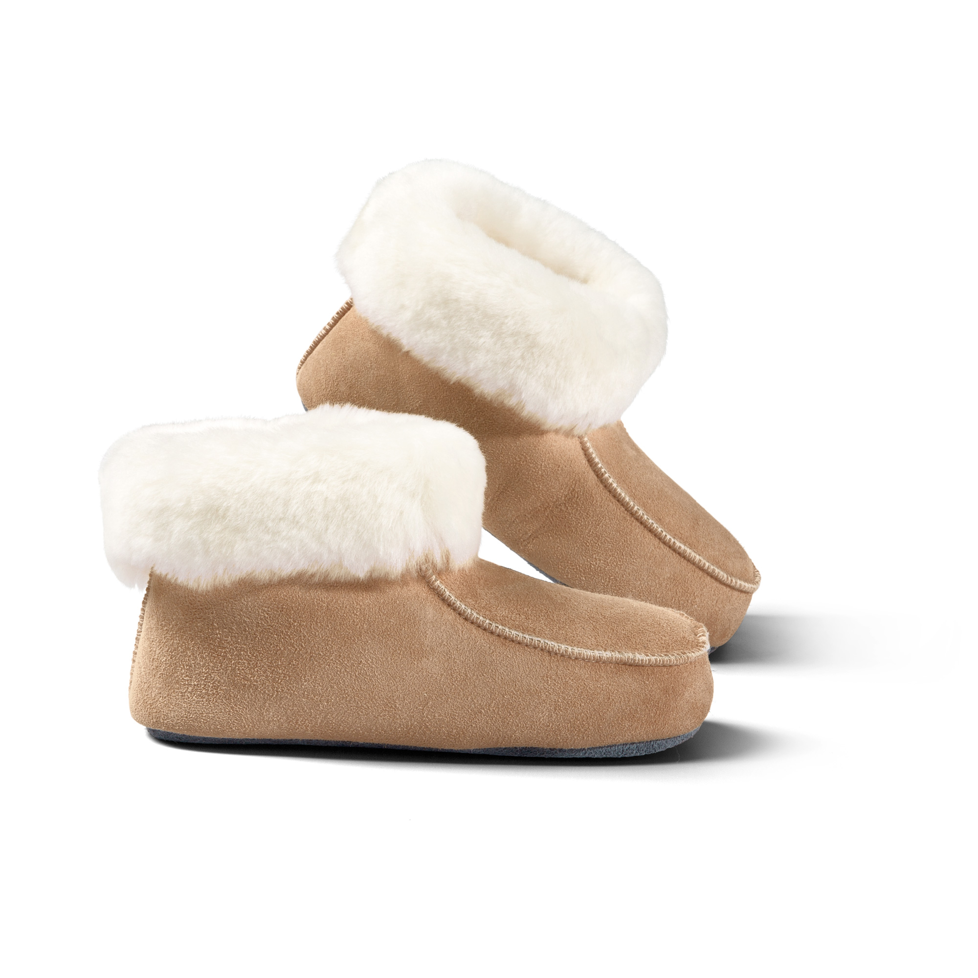 Die Fellhof Hüttenpatschen Kids vereinen alles, was die Füße Ihres Kindes brauchen, um warm und komfortabel durch den Winter zu kommen. In den Größen 25 bis 35 erhältlich, bieten diese knöchelhohen Hausschuhe optimalen Halt und sorgen für ein behagliches Tragegefühl – sowohl zu Hause als auch bei Ausflügen in die kalte Winterwelt. Die warm gefütterten Hüttenpatschen bestehen innen zu 100 % aus hochwertigem Lammfell, das nicht nur für eine exzellente Wärmeisolierung sorgt, sondern auch Feuchtigkeit zuverlässig von den Füßen fernhält. So bleibt der Fuß Ihres Kindes stets trocken und kuschelig warm. Das besonders weiche Material fühlt sich angenehm an und sorgt dafür, dass Ihre Kleinen keine kalten Füße bekommen, selbst bei langen Spielstunden im Haus. Der wärmende Überschlag aus Lammfell schützt zusätzlich vor Kälte und garantiert optimalen Komfort. Das pflegeleichte und robuste Außenmaterial aus Leder und Lammfell verleiht den Hüttenpatschen nicht nur eine edle Optik, sondern macht sie auch besonders strapazierfähig. Die verstärkte Ledersohle sorgt für sicheren Halt auf verschiedenen Untergründen und schützt die Füße beim Laufen. Im Angebot enthalten ist ein kuscheliges Mulltuch aus 100% Baumwolle.