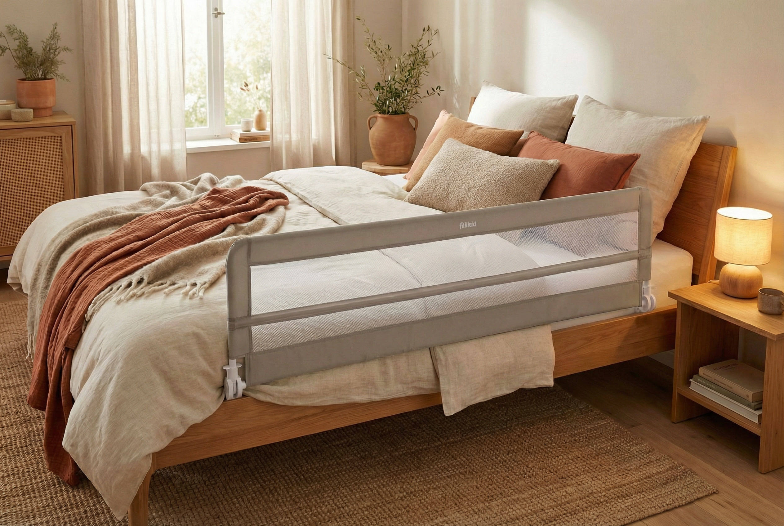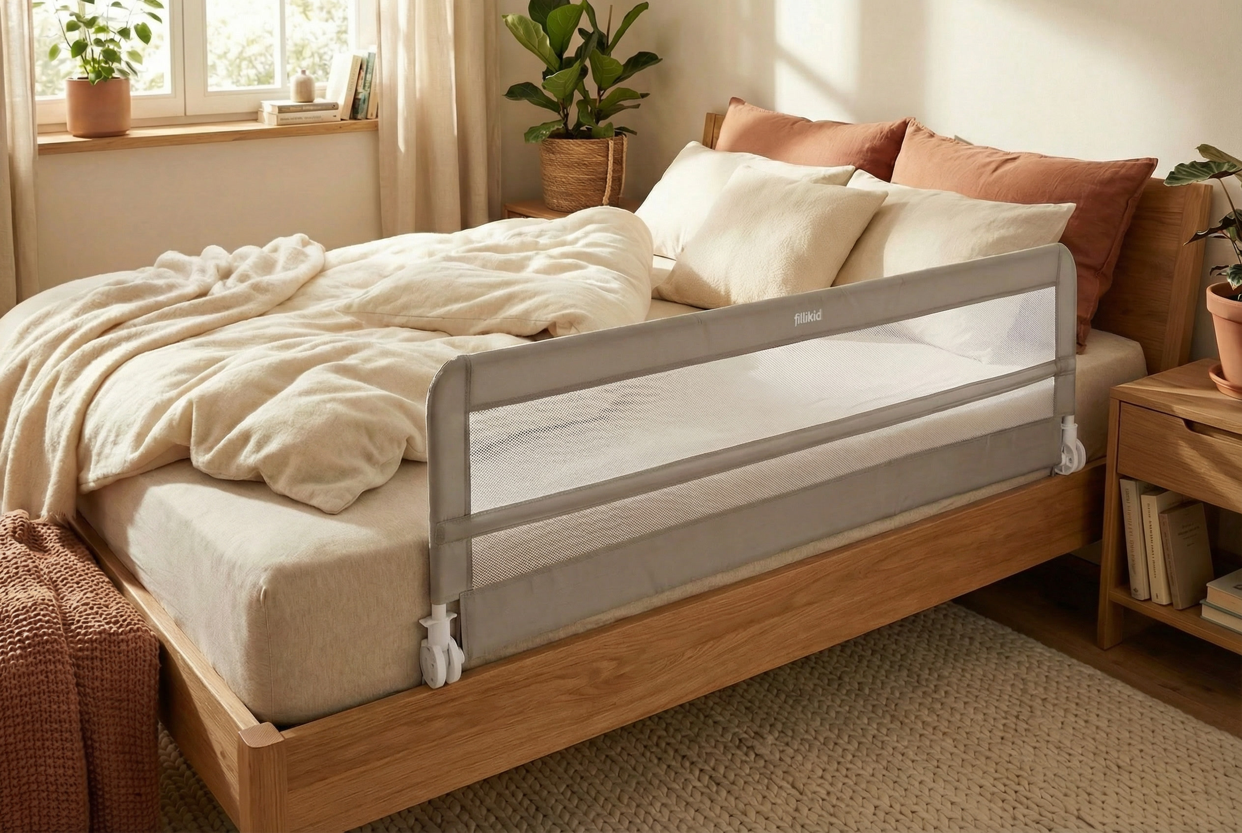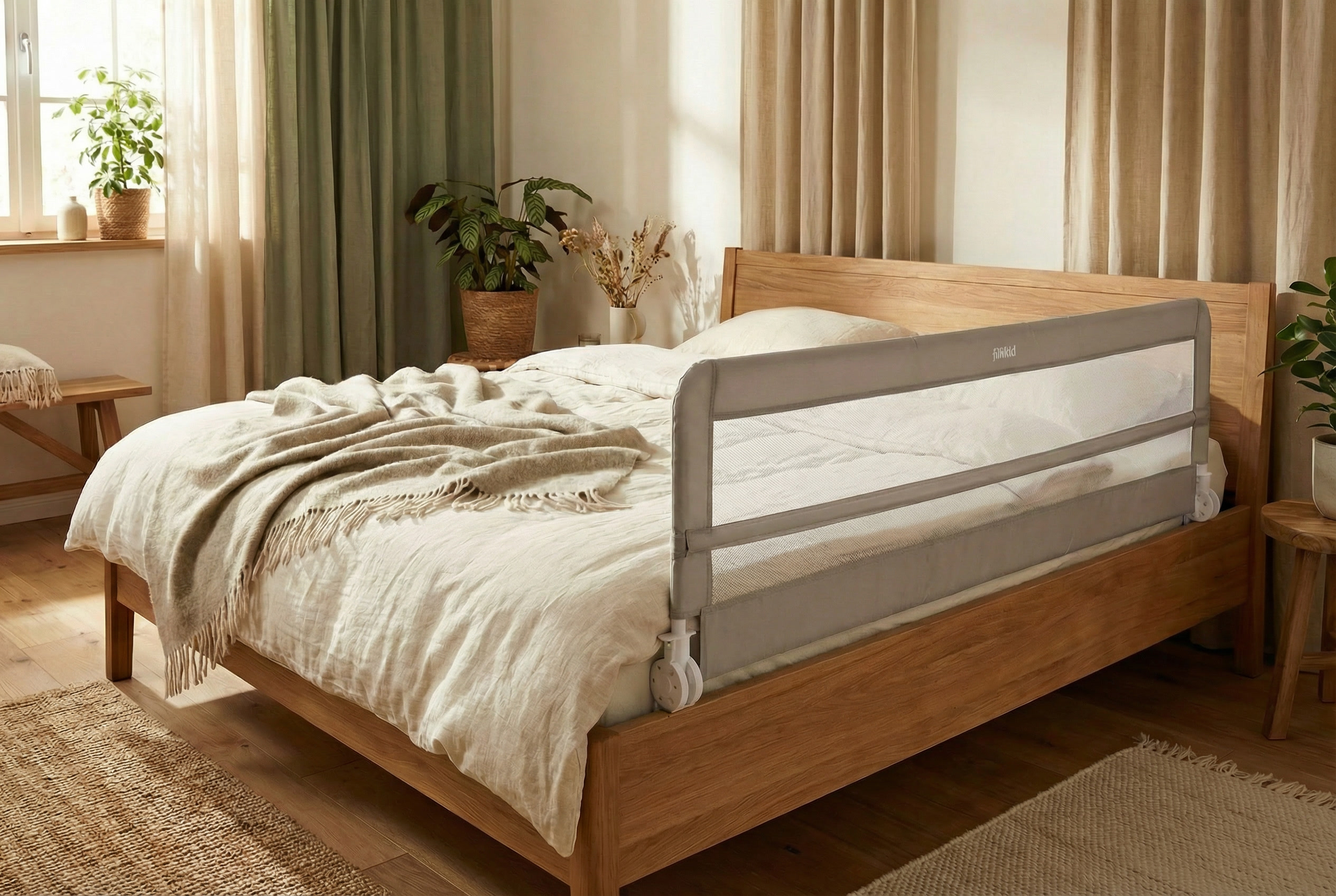 Die stabile Befestigung mit Spanngurt sorgt für einen sicheren Halt am Bettgestell. Das Bettgitter bleibt fest an seinem Platz und überzeugt durch hohe Standfestigkeit – auch bei unruhigem Schlaf. Gleichzeitig punktet das Modell mit einem leichten und praktischen Design, das sich harmonisch in jedes Schlafzimmer einfügt. Mit seinen Maßen von 180 × 50 cm bietet das Fillikid Bettgitter Lina XL optimalen Seitenschutz bei gleichzeitig angenehmer Höhe. Der Bezug aus 100 % Polyester ist strapazierfähig, pflegeleicht und langlebig – ideal für den täglichen Einsatz im Familienalltag.