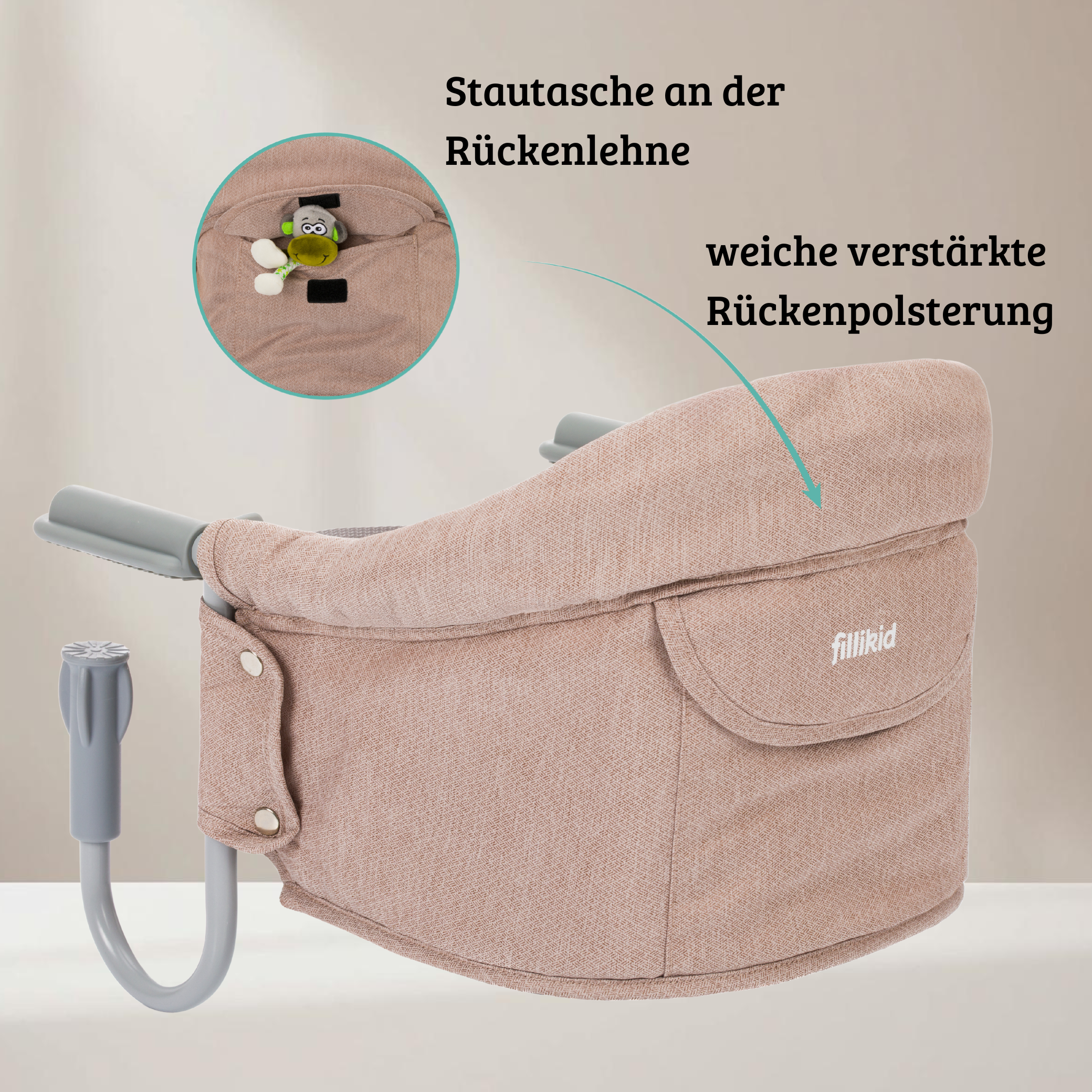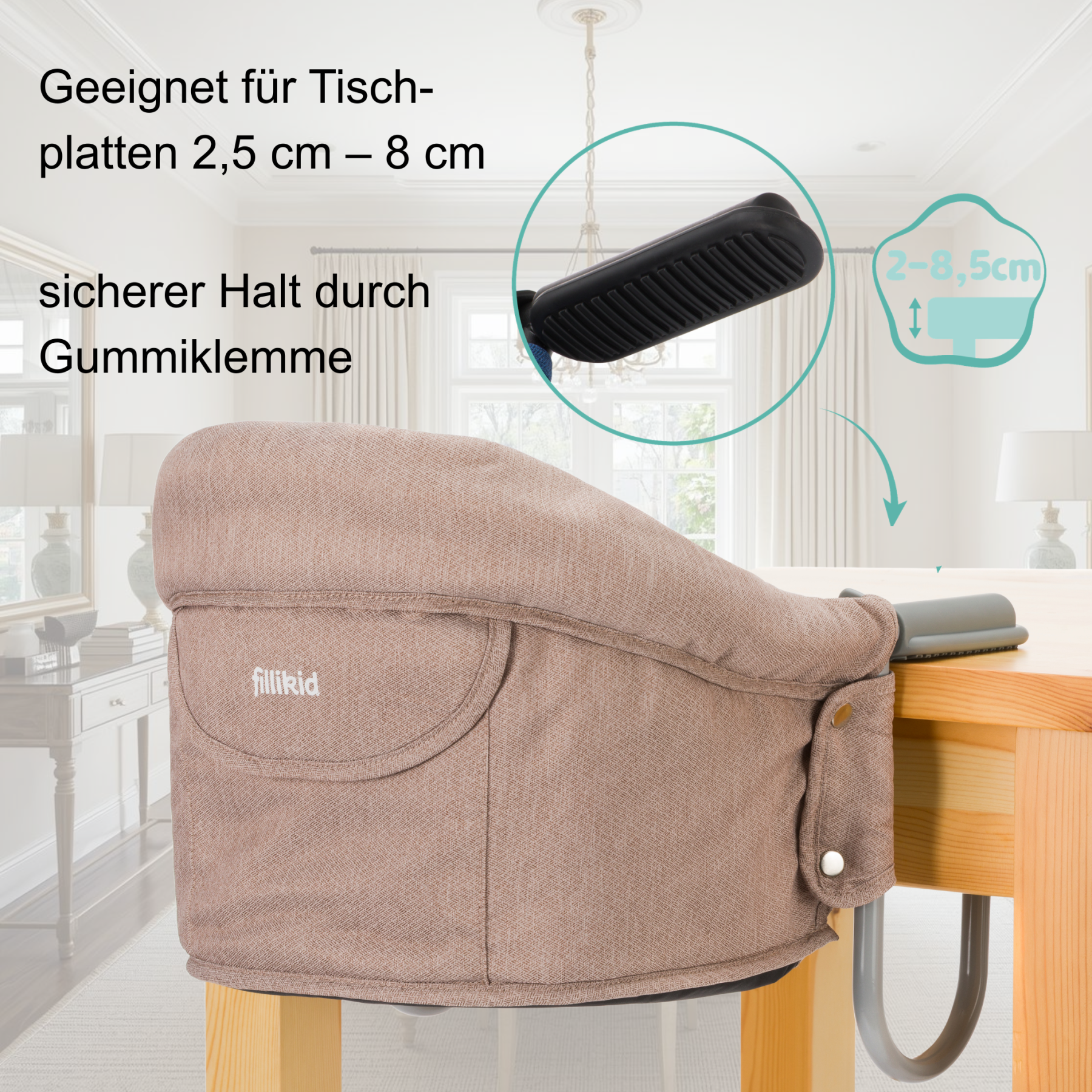 Der Tischsitz Flexi von Fillikid ist eine praktische Lösung für Zuhause und unterwegs. Mit der klappbaren Schraubfixierung lässt er sich schnell und sicher an Tischplatten mit einer Stärke von 2 bis 8,5 cm fixieren. Eine weiche Rückenpolsterung, zusammen mit einem integrierten Sicherheitsgurt sorgen dafür dass Ihr Kind besonders bequem und sicher darin sitzt. Zudem ist der Tischsitz mit einem praktischen Seitenfach an der Rückenlehne ausgestattet.