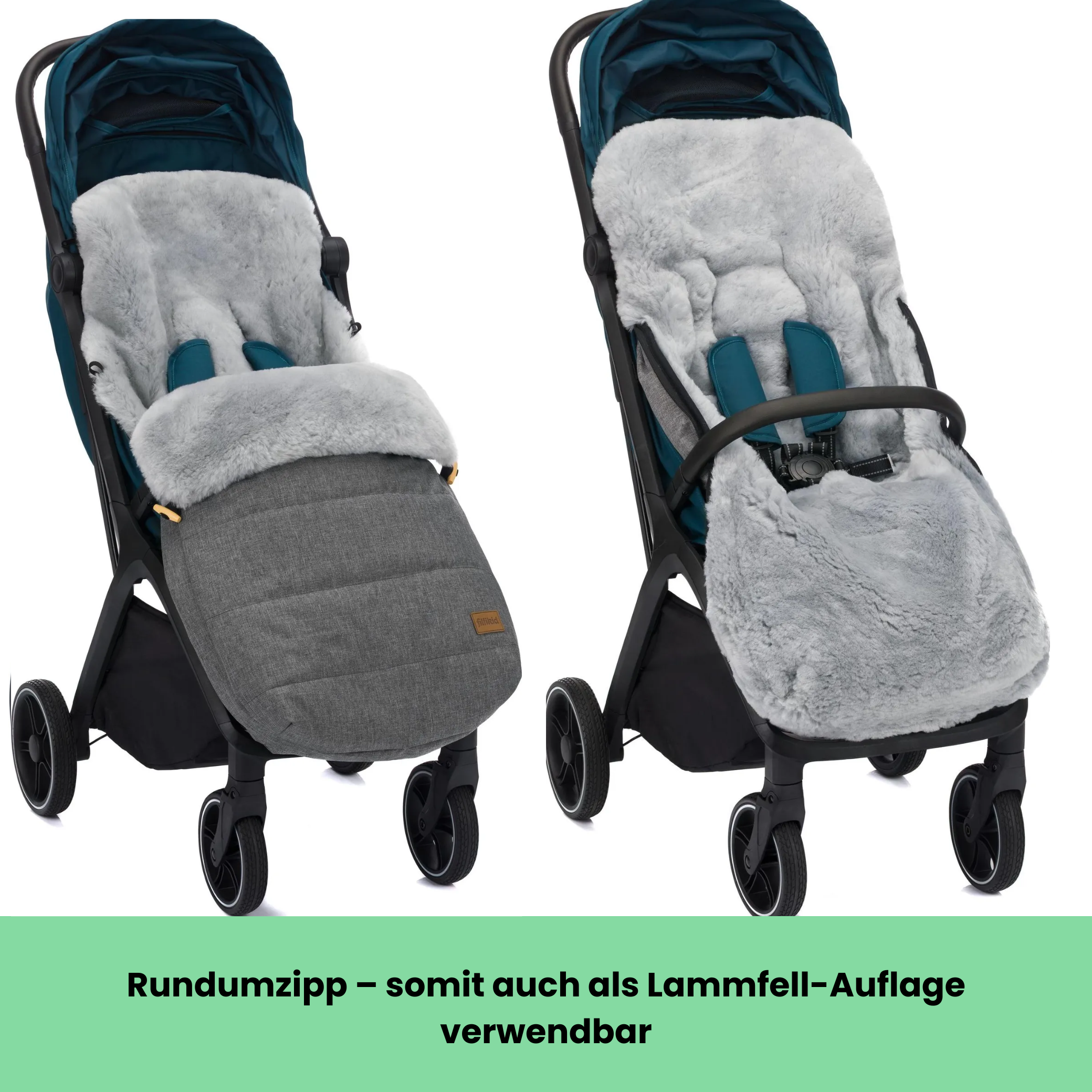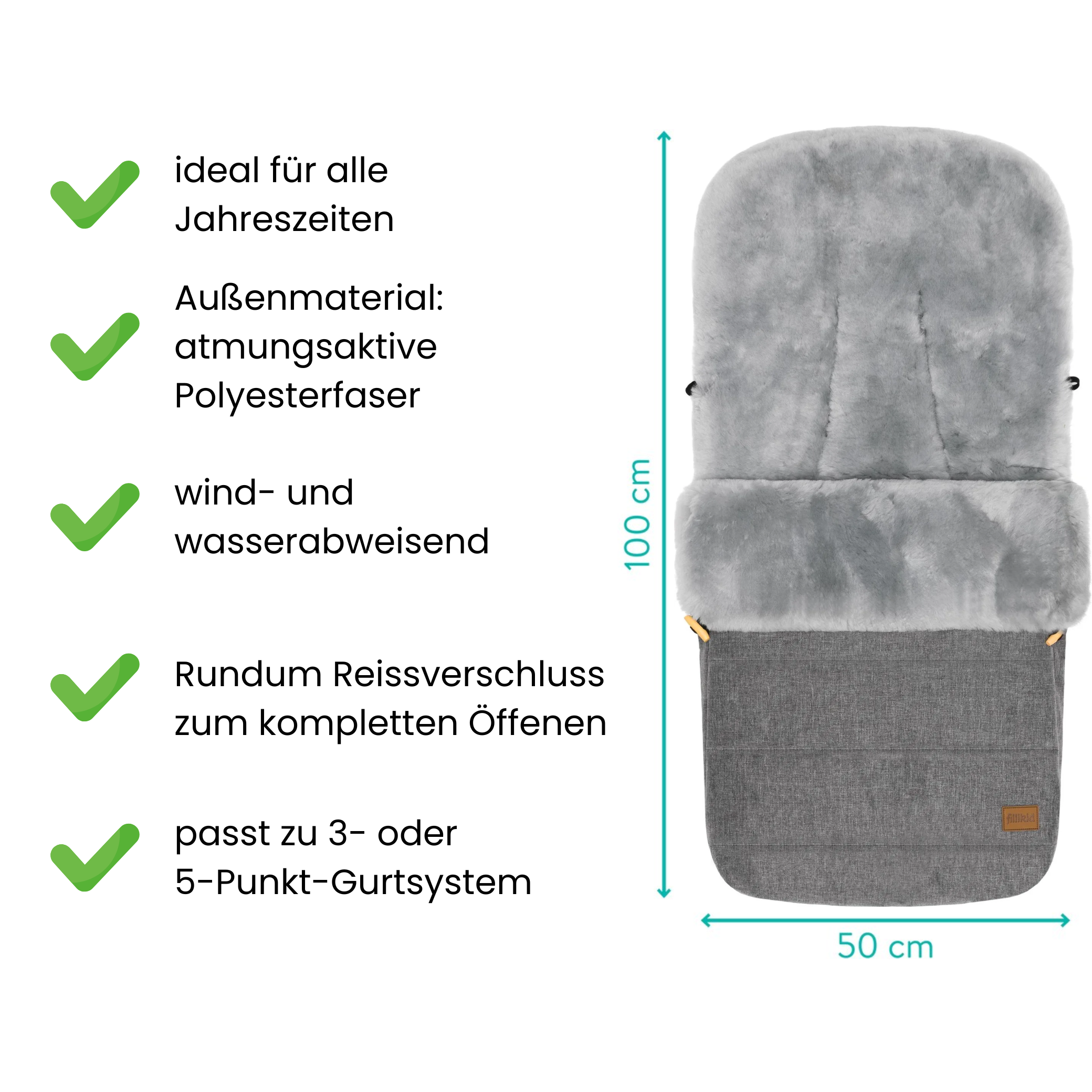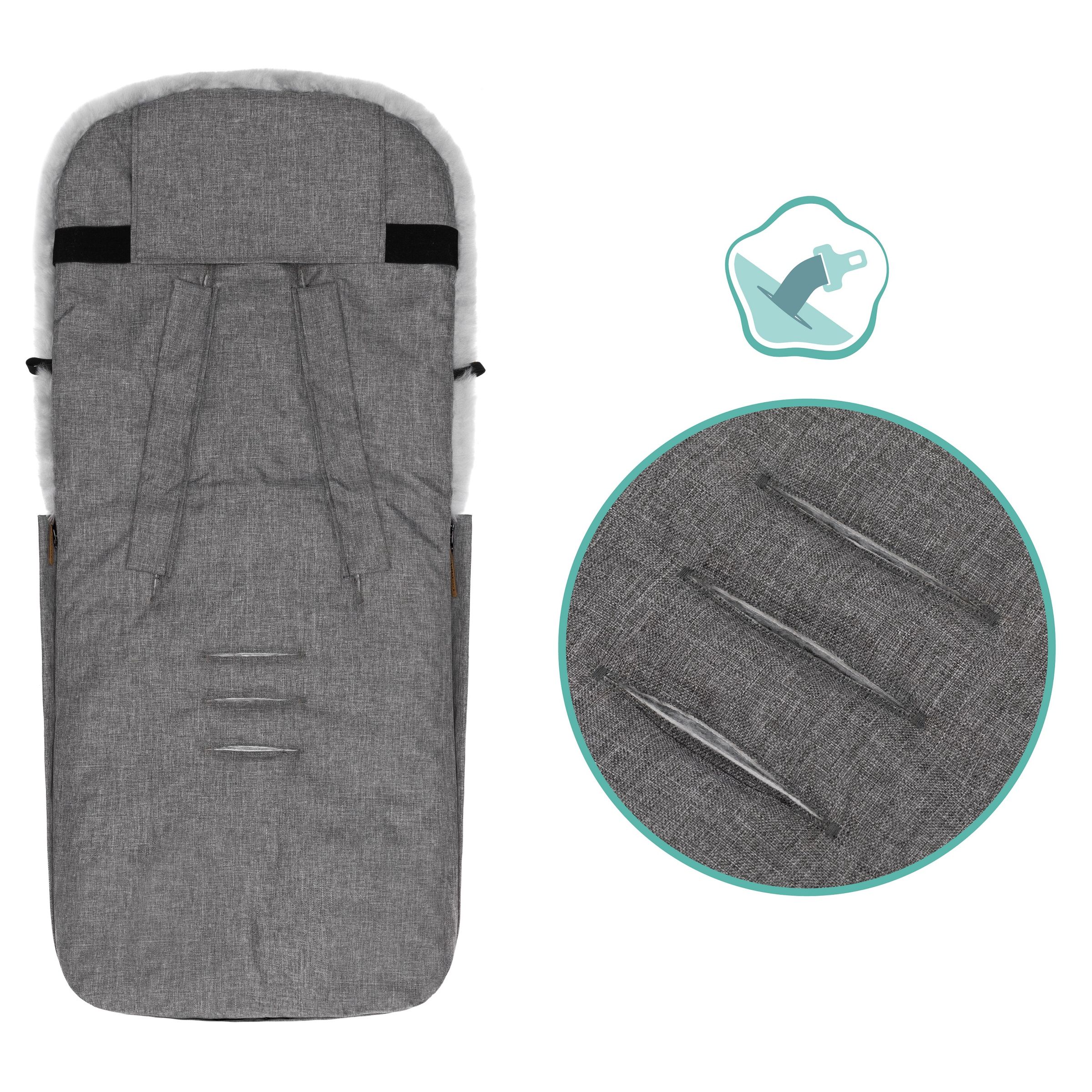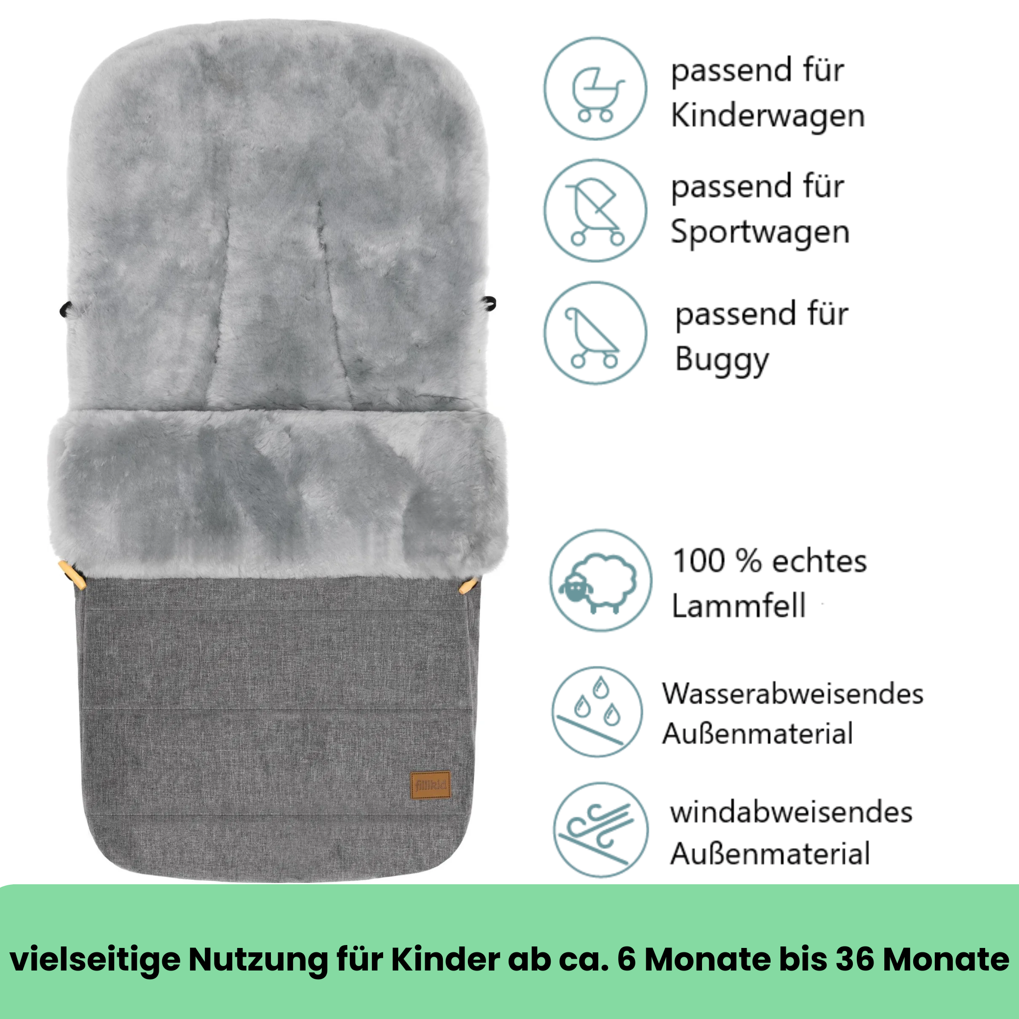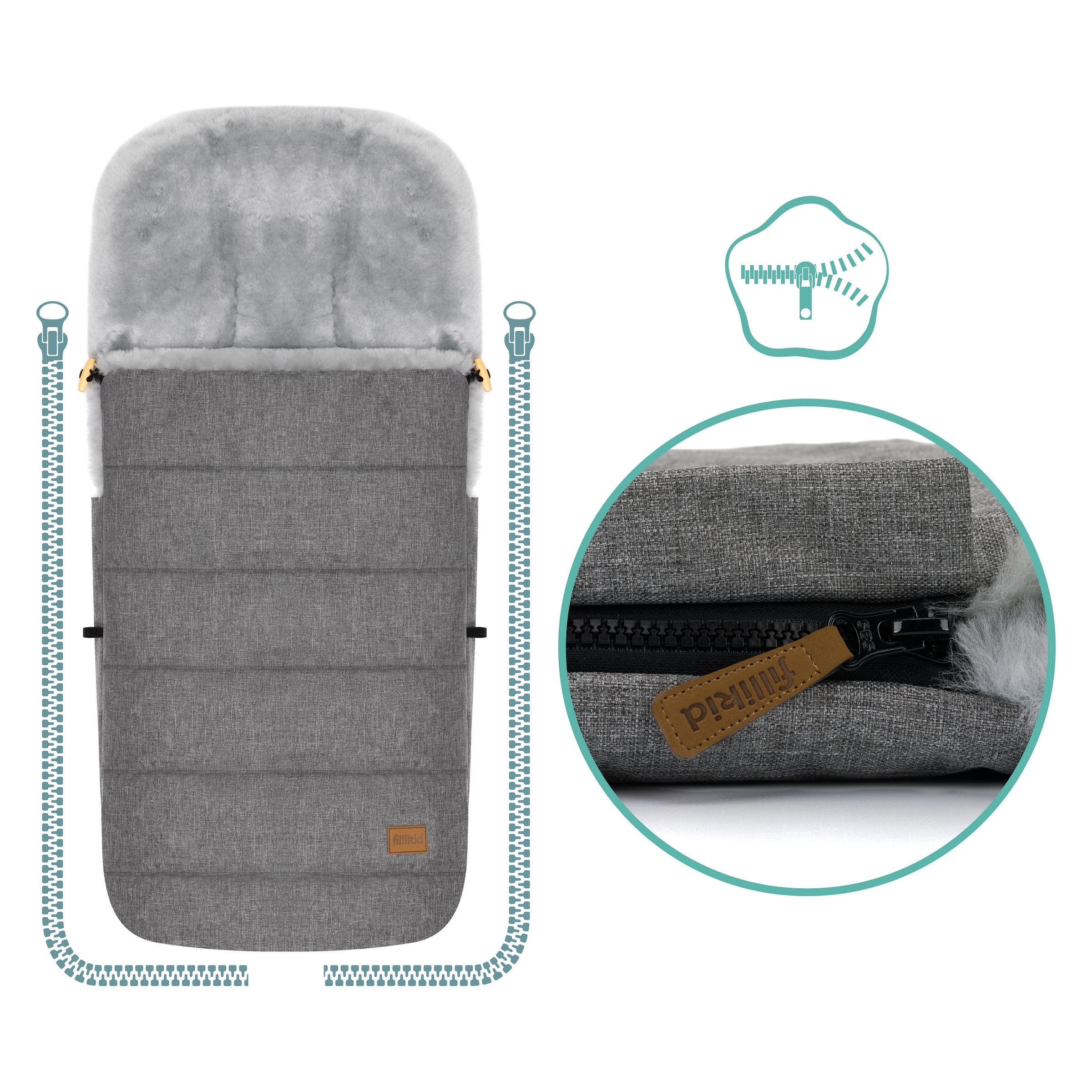 Dieser Fußsack von Fillikid mit echtem Lammfell eignet sich hervorragend für Ausflüge bei kalter Witterung. Ein Rundum-Reißverschluss erleichtert das Hineinlegen und Herausnehmen Ihres Kindes und ermöglicht die teilweise oder gar vollständige Öffnung des Fußsacks. Durch einen Rundum Reißverschluss ist das Oberteil einfach abnehmbar und somit lässt sich der Fußsack umwandeln zur Spiel- und Wickelfläche. Geeignet für Kinderwagen & Buggys hat es Ihr Baby in diesem Fußsack immer schön warm und kuschelig. Integrierte Gurtschlitze zur Durchführung von Sicherheitsgurten und eine Lasche zur Befestigung an der Rückenlehne sorgen zudem für optimalen Halt und verhindern so effektiv ein ungewolltes Herausrutschen.