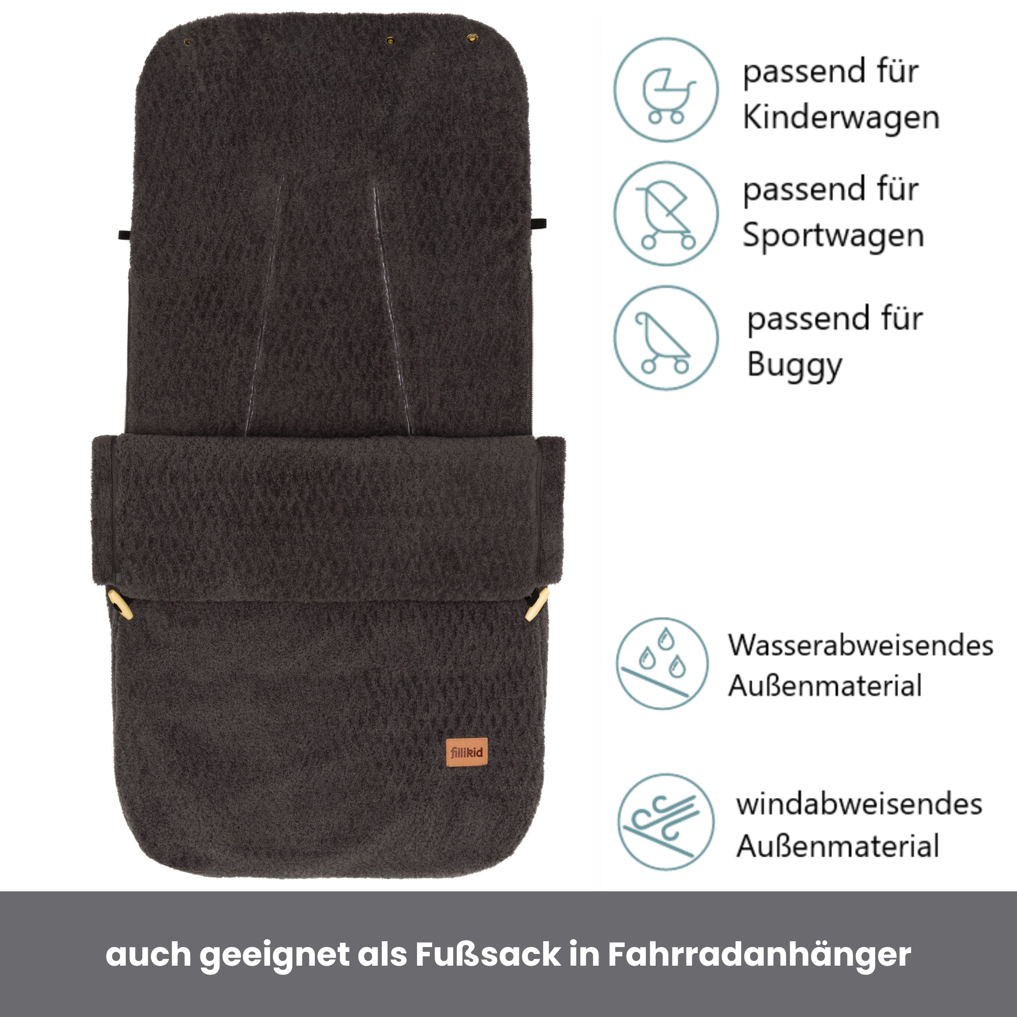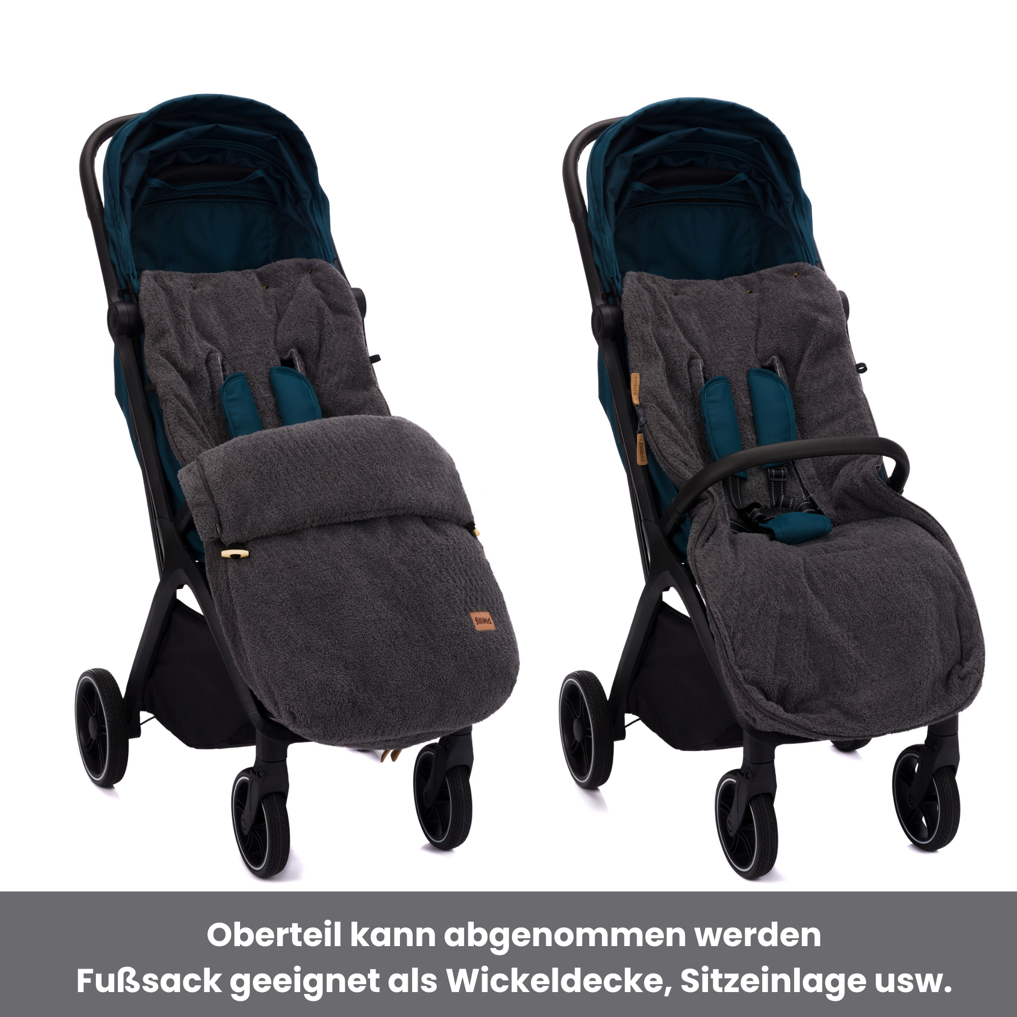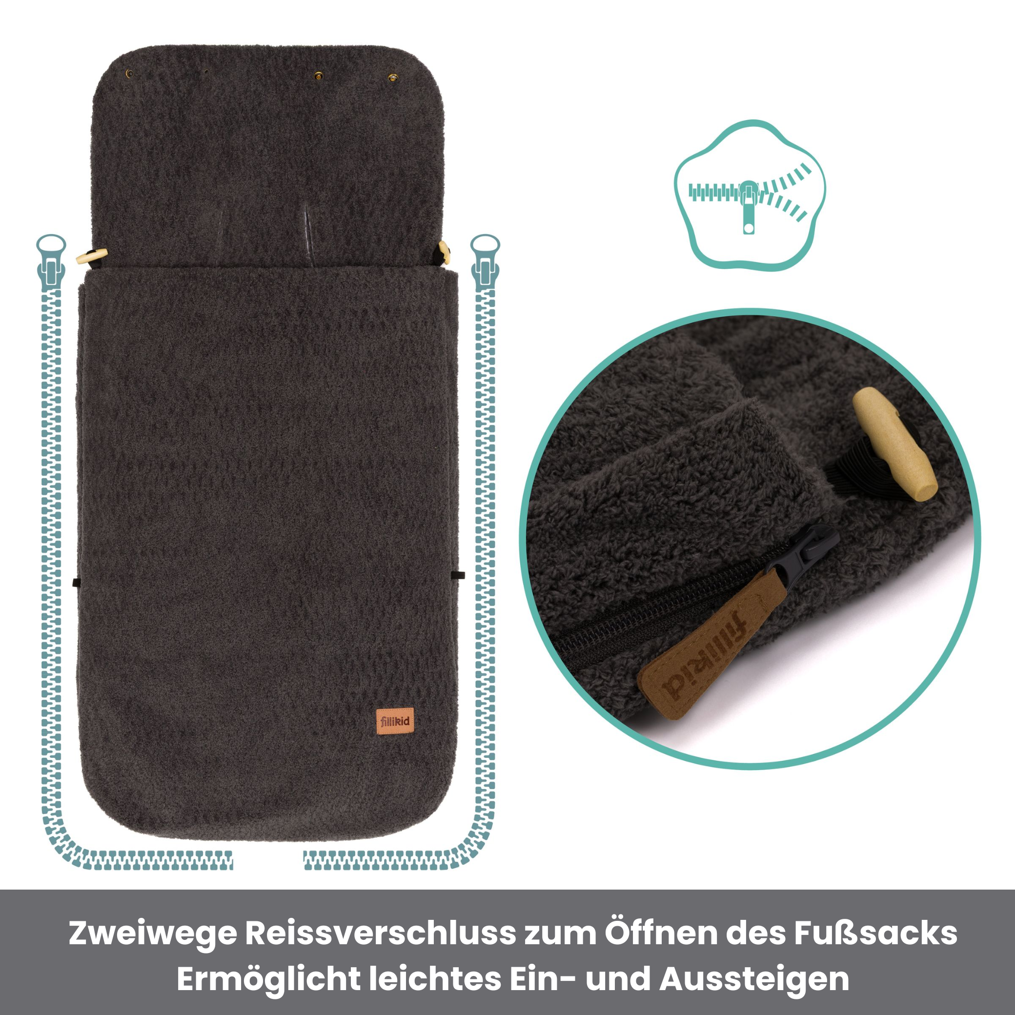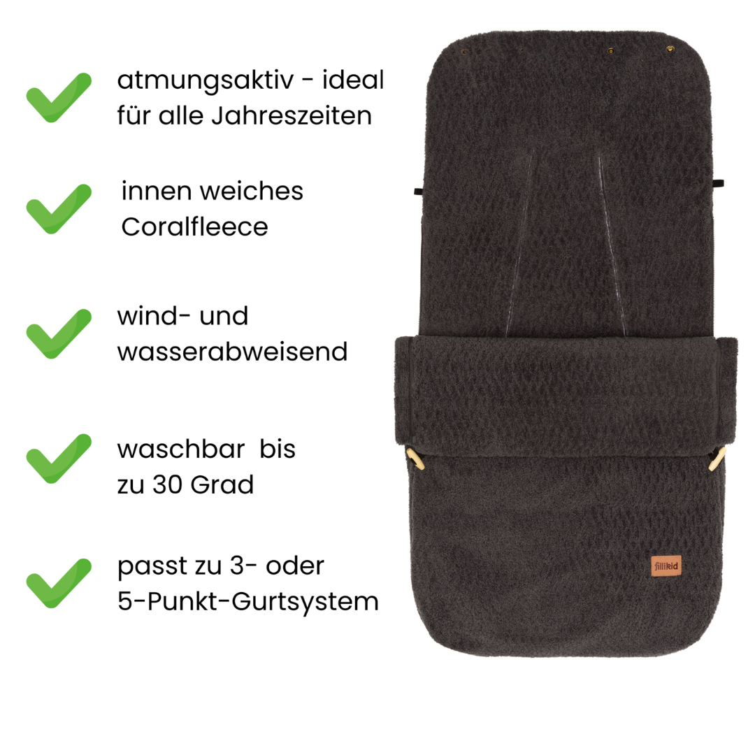 Der Fillikid Winterfußsack Elias Exklusiv bietet Babys an kalten Tagen optimalen Komfort und wohlige Wärme. Das weiche Innenfutter hüllt Ihr Kind sanft ein und sorgt für ein gemütliches Nestgefühl im Kinderwagen oder Buggy. Das robuste, wind- und wasserabweisende Außenmaterial schützt zuverlässig vor Kälte, Wind und Nässe. Der Fusssack Elias ist vollständig aus hochwertigem Teddy-Material gefertigt – aussen und innen kuschlig weich. Fünf Gurtschlitze ermöglichen sicheren Einsatz im Wagen, während die Druckknöpfe das Kopfteil zur Kapuze umfunktionieren. Die Fussöffnung mit Reissverschluss erleichtert das Ein- und Aussteigen und reguliert die Temperatur. Pflegeleicht und hygienisch bei 30 °C waschbar – ein treuer Begleiter bei allen Ausflügen. Praktische Gurtschlitze für 5-Punkt-Gurte und seitliche Reißverschlüsse ermöglichen eine einfache Befestigung und erleichtern das Ein- und Aussteigen. Der Elias Exklusiv kombiniert hochwertige Materialien, pflegeleichte Eigenschaften und langlebige Verarbeitung zu einem funktionalen, stilvollen Accessoire – perfekt für Spaziergänge im Herbst und Winter.