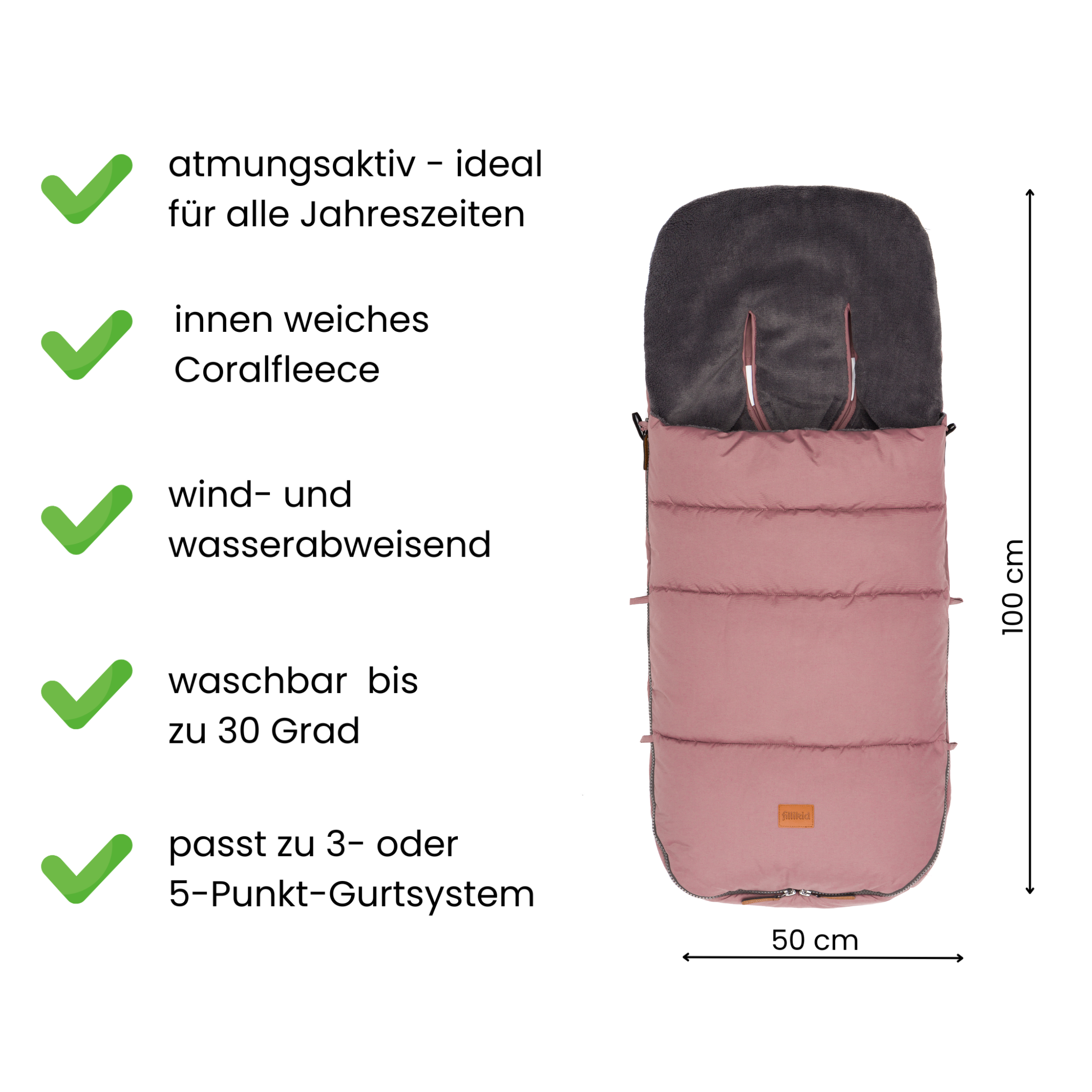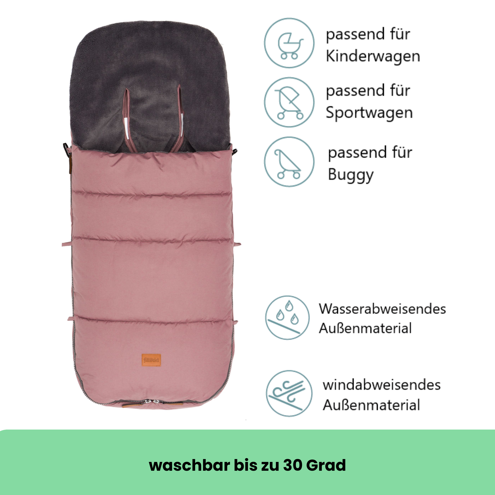 Der Universal Fußsack bietet Ihrem Kind Schutz und Wärme. Das strapazierfähige Außenmaterial ist wasser- und windabweisend. Für Herbst und Winter sind Sie so bestens gerüstet. Die Abdeckung über dem Reißverschluss schützt zusätzlich vor kaltem Wind. Dieser schicke Winterfußsack von Fillikid besticht durch sein schlichtes Design und durchdachte Funktionalität. Geeignet für Kinderwagen & Buggys lassen sich mit diesem Fußsack Spaziergänge zu kälteren Jahreszeiten unternehmen, zu welcher es Ihr Baby schön warm und kuschelig darin hat. Integrierte Gurtschlitze zur Durchführung von Sicherheitsgurten, zusammen mit einer optimalen Passform verhindern so effektiv ein ungewolltes Herausrutschen. Mittels Rundum-Reißverschluss lässt sich zudem der Innenbereich des Fußsacks abtrennen und so separat als Sitzauflage nutzen.