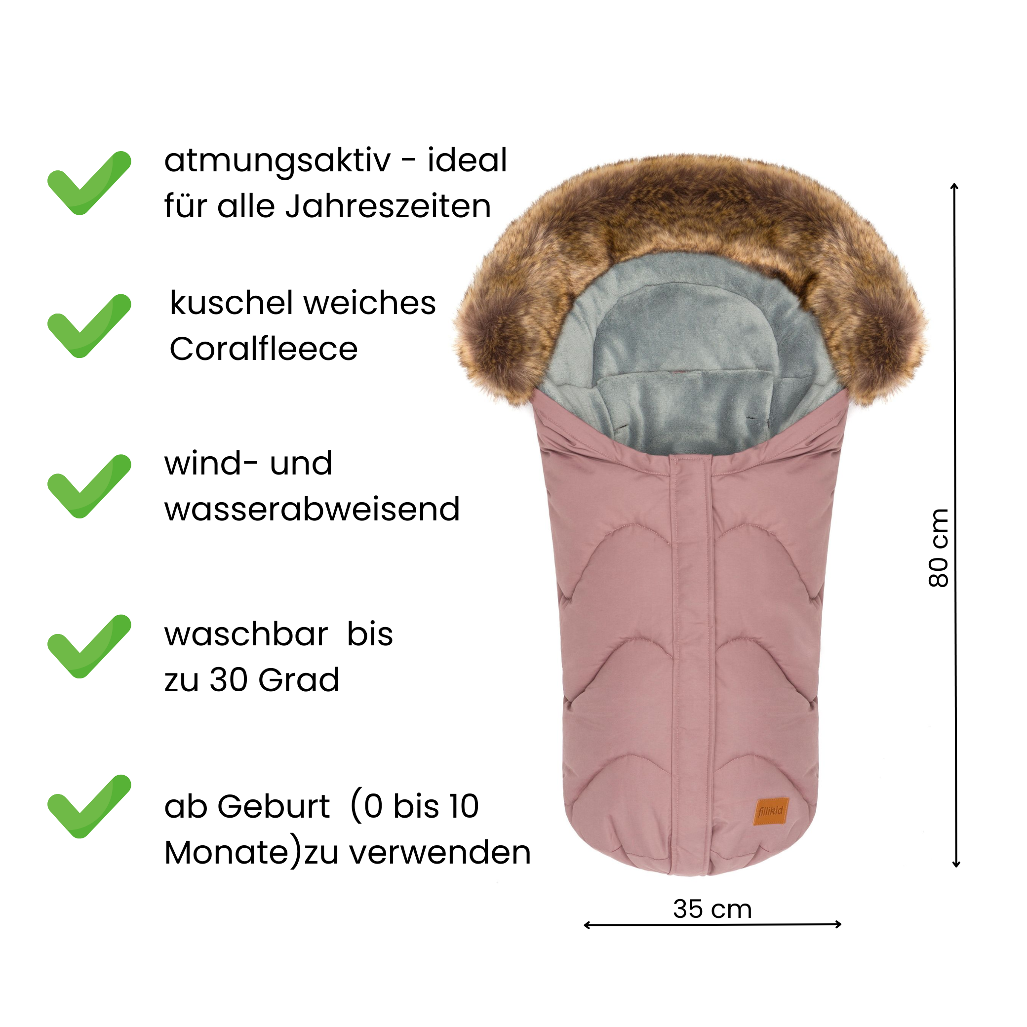 Ein Kinderschlafsack für Babys ist mittlerweile unersetzbar geworden und kann vor dem plötzlichen Baby Kindstod durch Wärmestau bewahren. Gerade für Neugeborene, die sich noch nicht selbständig drehen können, ist eine Zudecke eher gefährlich und zudem besteht die Gefahr des Wärmeverlustes oder Wärmestaus. Dieser schicke Winterfußsack von Fillikid besticht durch sein modernes Design und durchdachte Funktionalität. Geeignet für Kinderwagen & Kinderautositze (Gruppe 0) lassen sich mit diesem Fußsack Spaziergänge zu kalten Jahreszeiten unternehmen, zu welcher es Ihr Baby schön warm und kuschelig darin hat. Integrierte Gurtschlitze zur Durchführung von Sicherheitsgurten, zusammen mit einer Anti-Rutsch Rückseite sorgen zudem für optimalen Halt und verhindern so effektiv ein ungewolltes Herausrutschen. Der Kopfbereich lässt sich über einen Kordelzug einfach anpassen und schützt so den empfindlichen Babykopf optimal vor Kälte und Zugluft.