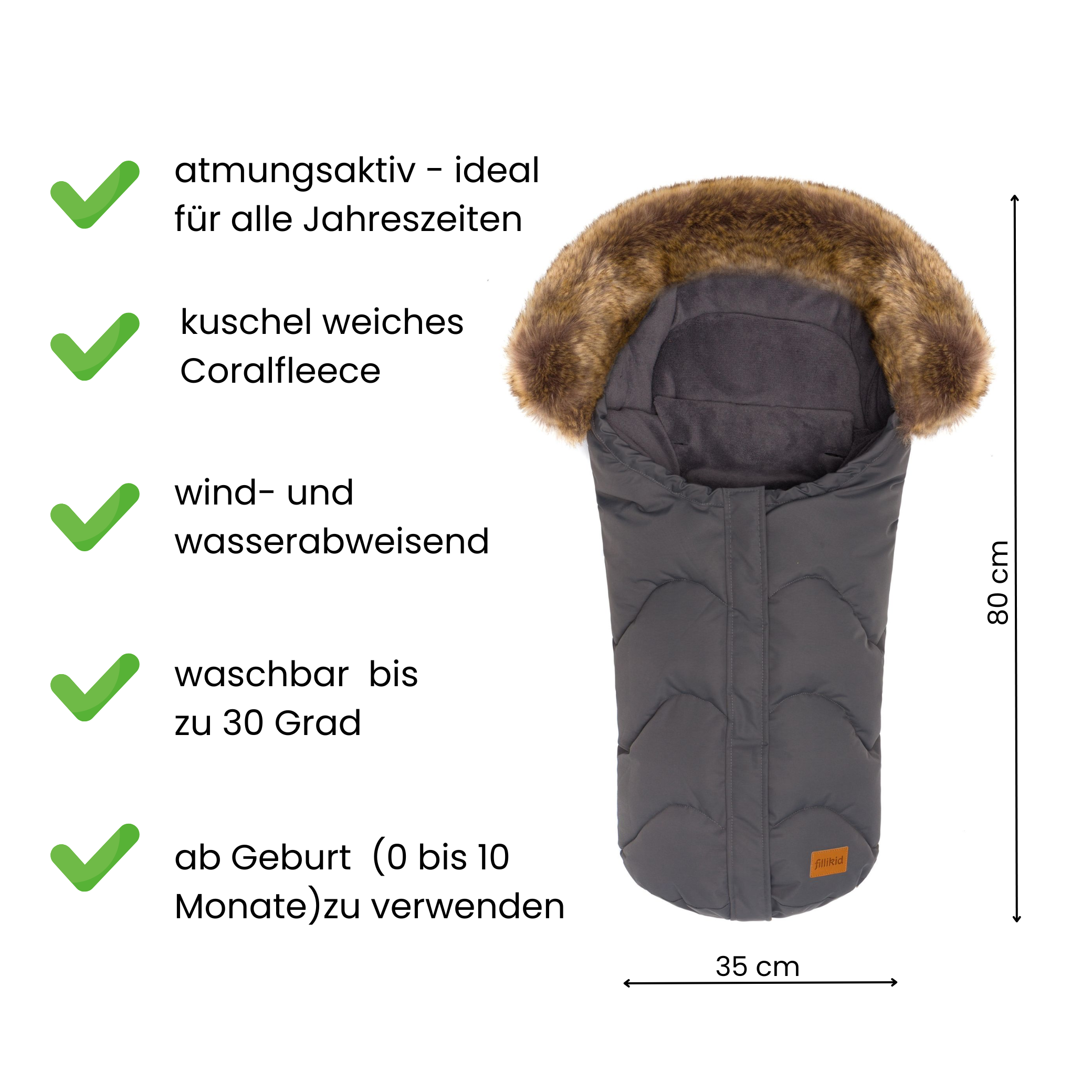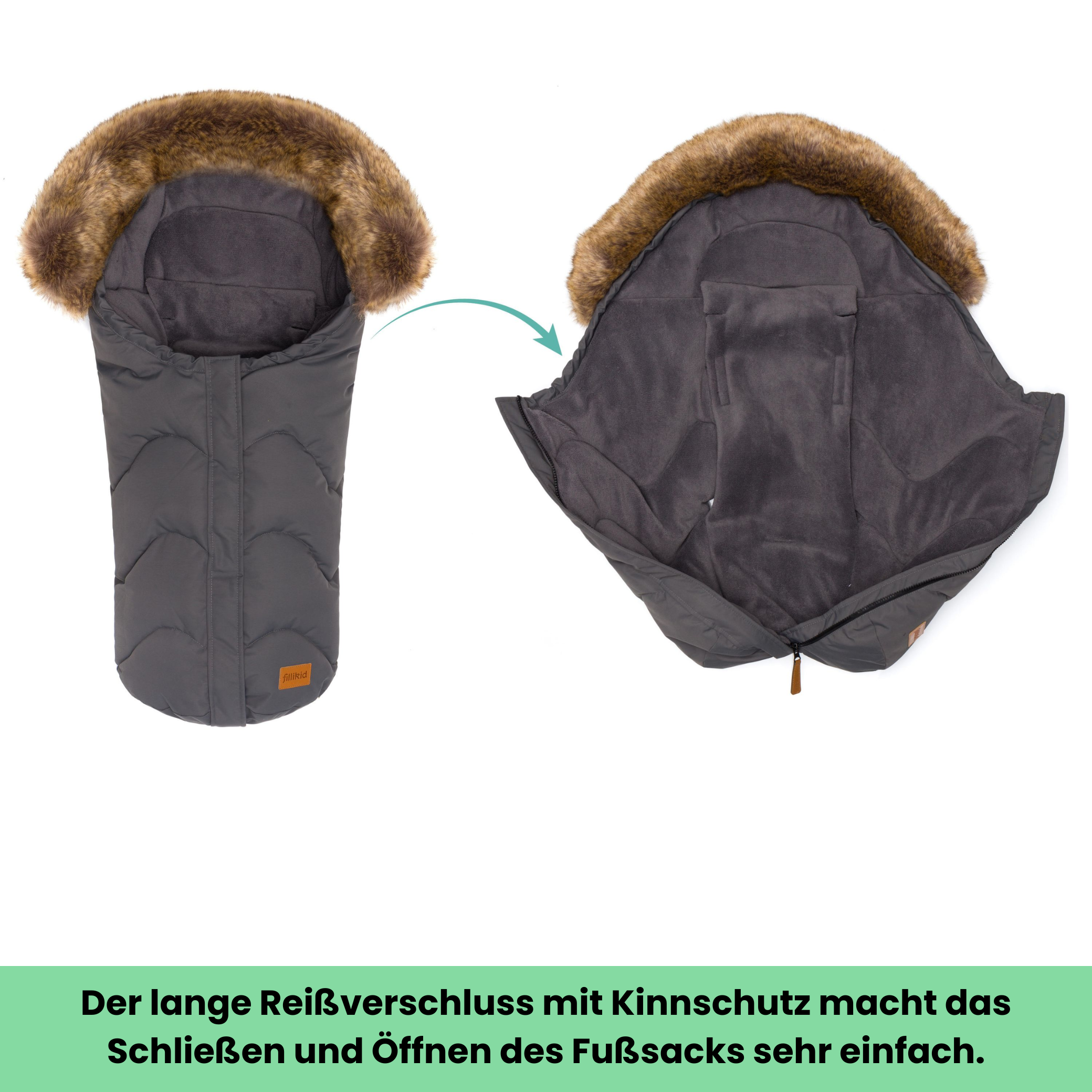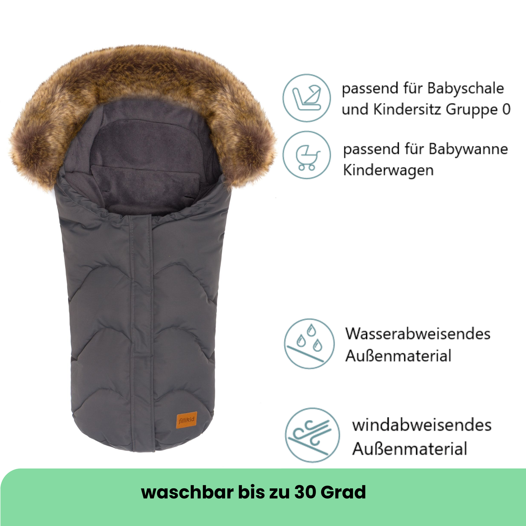 Ein Kinderschlafsack für Babys ist mittlerweile unersetzbar geworden und kann vor dem plötzlichen Baby Kindstod durch Wärmestau bewahren. Gerade für Neugeborene, die sich noch nicht selbständig drehen können, ist eine Zudecke eher gefährlich und zudem besteht die Gefahr des Wärmeverlustes oder Wärmestaus. Dieser schicke Winterfußsack von Fillikid besticht durch sein modernes Design und durchdachte Funktionalität. Geeignet für Kinderwagen & Kinderautositze (Gruppe 0) lassen sich mit diesem Fußsack Spaziergänge zu kalten Jahreszeiten unternehmen, zu welcher es Ihr Baby schön warm und kuschelig darin hat. Integrierte Gurtschlitze zur Durchführung von Sicherheitsgurten, zusammen mit einer Anti-Rutsch Rückseite sorgen zudem für optimalen Halt und verhindern so effektiv ein ungewolltes Herausrutschen. Der Kopfbereich lässt sich über einen Kordelzug einfach anpassen und schützt so den empfindlichen Babykopf optimal vor Kälte und Zugluft.