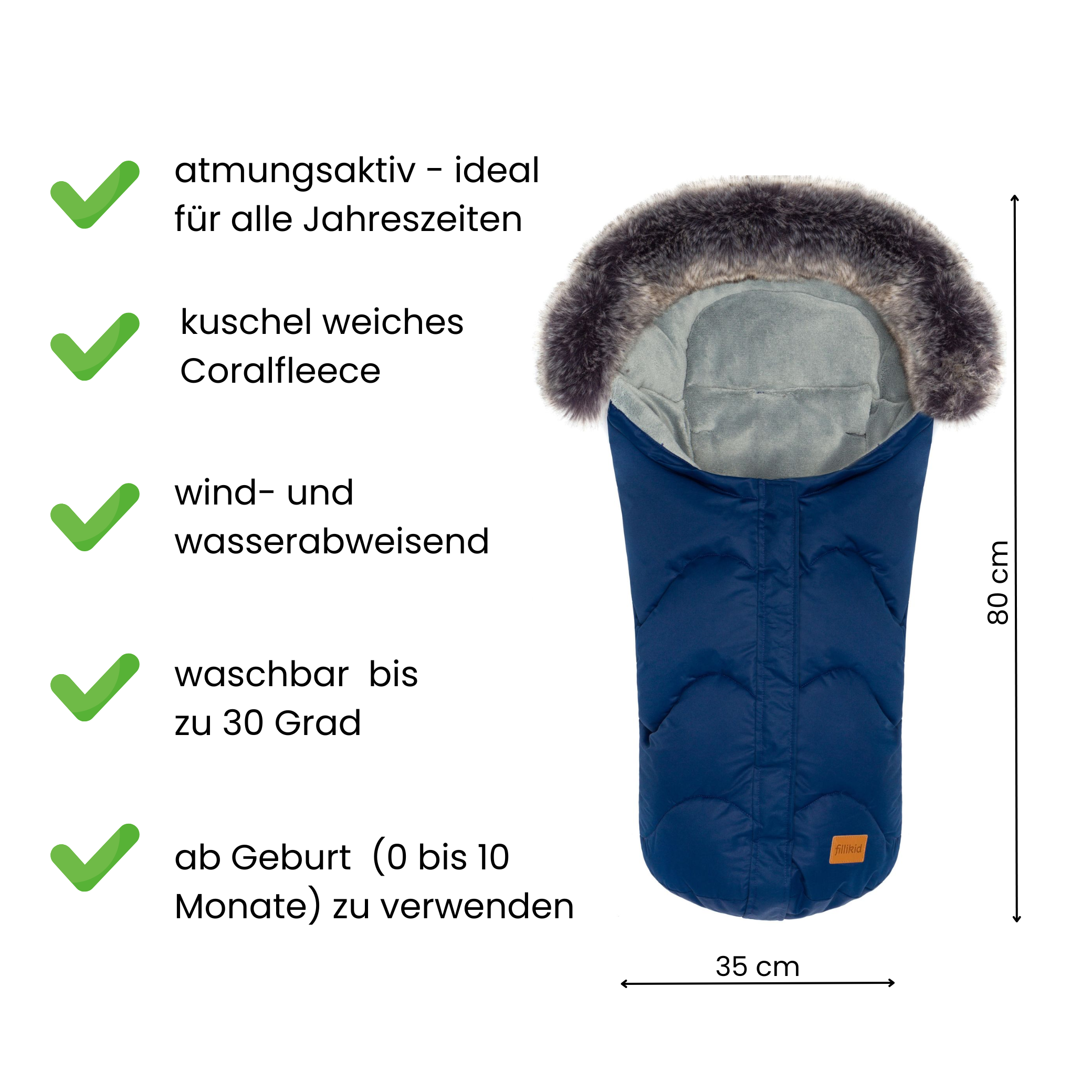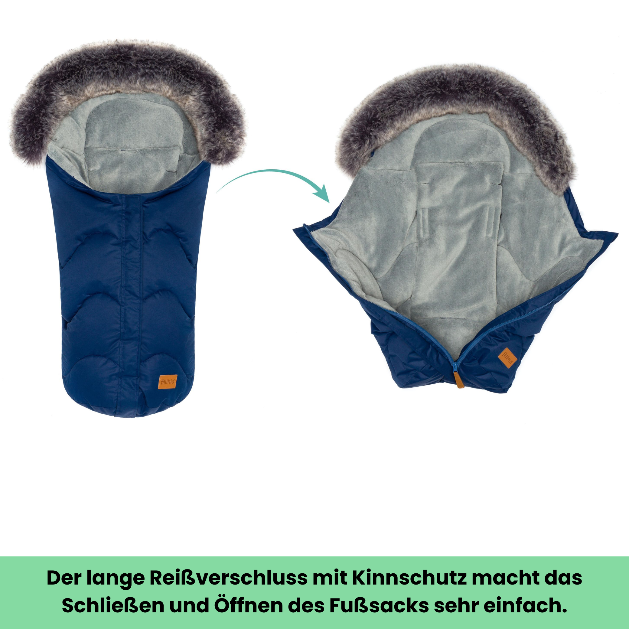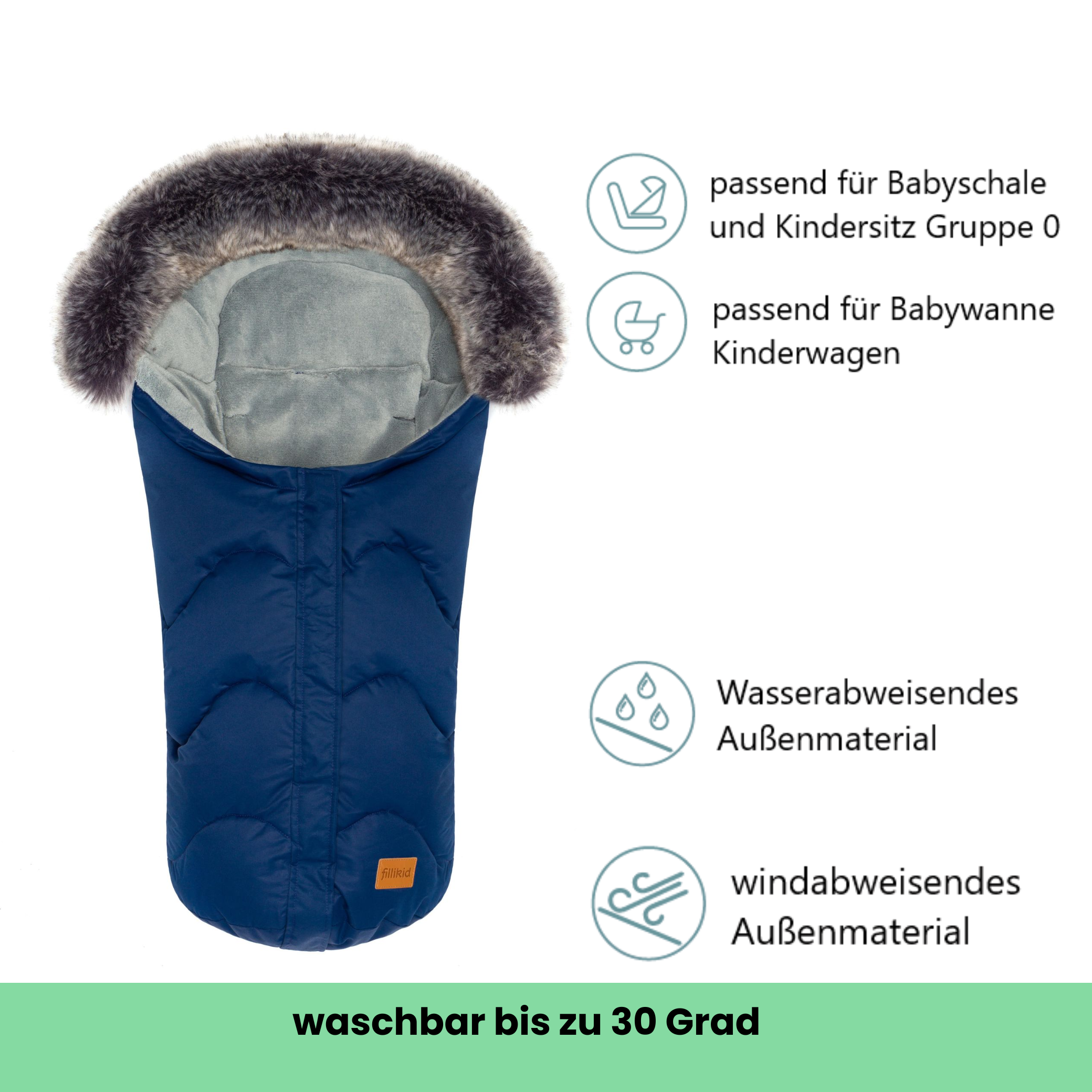 Ein Kinderschlafsack für Babys ist mittlerweile unersetzbar geworden und kann vor dem plötzlichen Baby Kindstod durch Wärmestau bewahren. Gerade für Neugeborene, die sich noch nicht selbständig drehen können, ist eine Zudecke eher gefährlich und zudem besteht die Gefahr des Wärmeverlustes oder Wärmestaus. Dieser schicke Winterfußsack von Fillikid besticht durch sein modernes Design und durchdachte Funktionalität. Geeignet für Kinderwagen & Kinderautositze (Gruppe 0) lassen sich mit diesem Fußsack Spaziergänge zu kalten Jahreszeiten unternehmen, zu welcher es Ihr Baby schön warm und kuschelig darin hat. Integrierte Gurtschlitze zur Durchführung von Sicherheitsgurten, zusammen mit einer Anti-Rutsch Rückseite sorgen zudem für optimalen Halt und verhindern so effektiv ein ungewolltes Herausrutschen. Der Kopfbereich lässt sich über einen Kordelzug einfach anpassen und schützt so den empfindlichen Babykopf optimal vor Kälte und Zugluft.