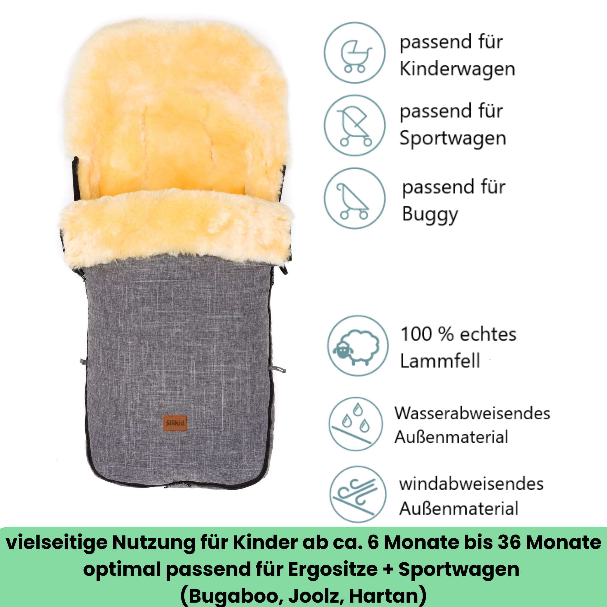Der schöne Winterfußsack Makalu besteht aus natürlichem, medizinisch gegerbtem Lammfell. Sein spezieller Schnitt ist darauf ausgelegt, dass er perfekt in Kinderwägen mit abgewinkeltem Sitzteil, wie etwa der Marke Bugaboo, Joolz etc. passt. Durch seine Größe und seine kuschelige Fellfütterung ist er perfekt um auch an kalten Tagen ausreichend zu wärmen. Dank der langen Gurtschlitze können Sie den Fußsack ganz leicht in allen gängigen Kinderwagen befestigen. Das Vorderteil lässt sich seitlich durch einen Rundum-Reißverschluss öffnen und ermöglicht dadurch, den Fußsack als kuschelige Fellauflage zu verwenden.