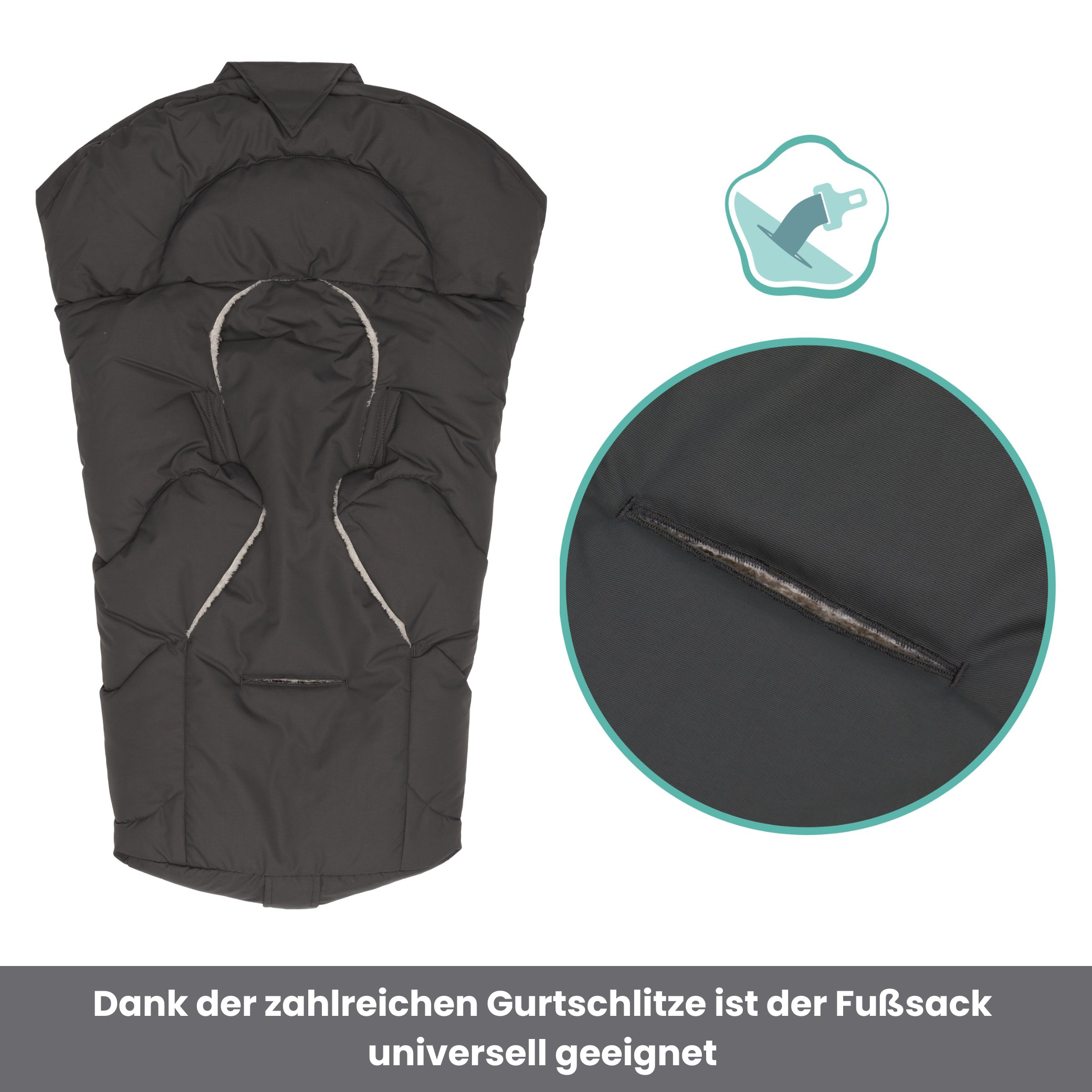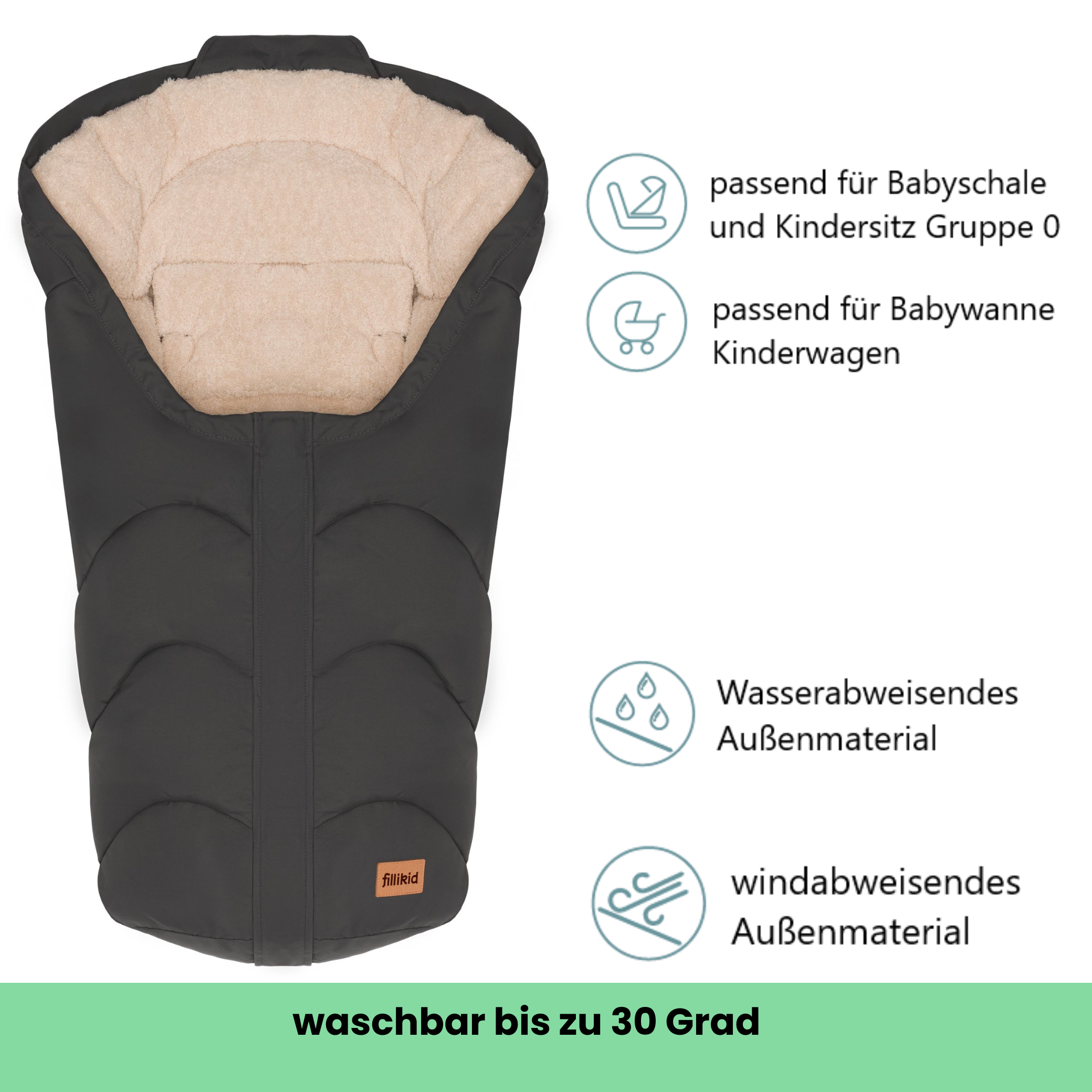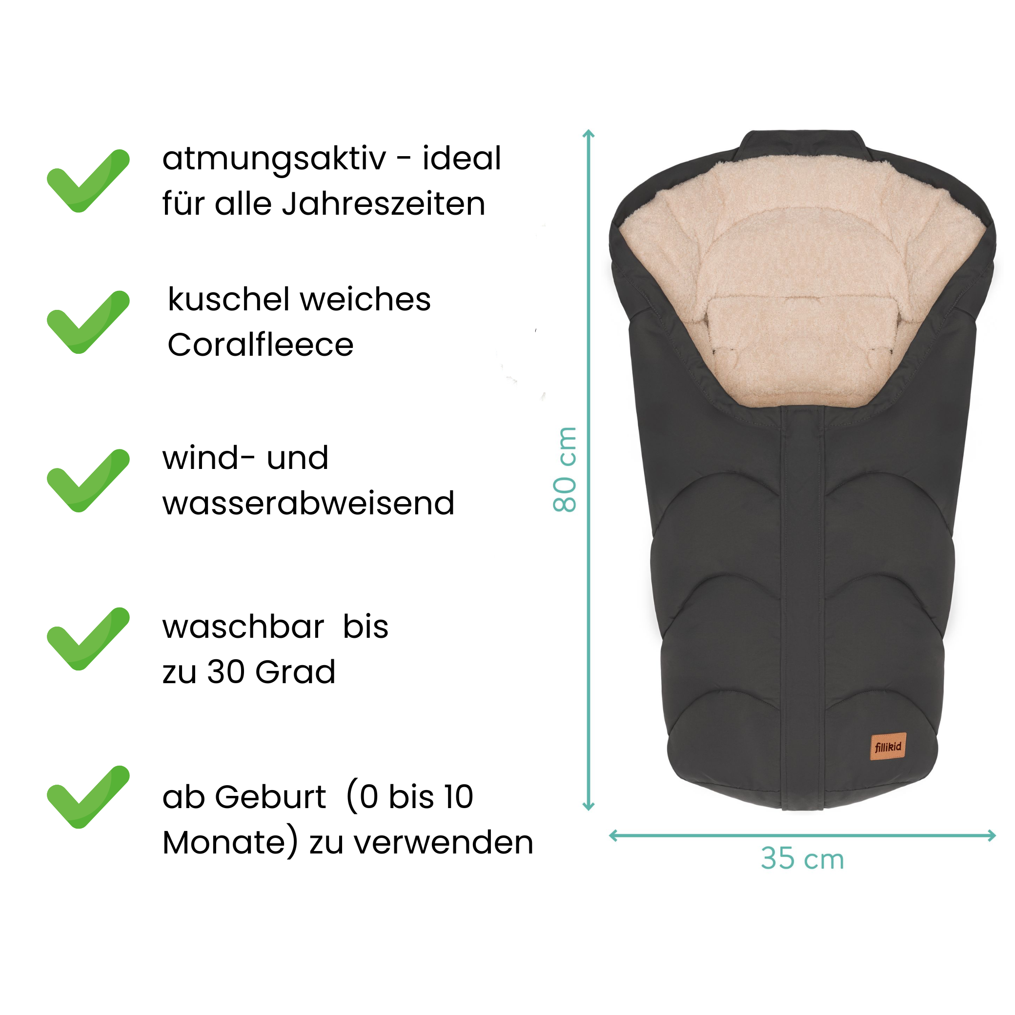 Der Fillikid Fusssäckchen Torre hält Ihr Baby zuverlässig warm – ob im Autositz der Gruppe 0 oder im Kinderwagen. Innen sorgt weiches Teddyplüsch für Geborgenheit, während das winddichte und wasserabweisende Aussenmaterial aus Polyester optimalen Schutz bietet. Für zusätzliche Sicherheit ist der Fusssack mit Gurtschlitzen für 3‑ und 5‑Punkt-Gurtsysteme ausgestattet – ideal für flexible Einsätze bei jeder Witterung. Der Fillikid Torre Fusssack eignet sich für Autositze der Gruppe 0 sowie für den Einsatz im Kinderwagen. Aussen schützt wasserabweisendes Polyester vor Wind und Feuchtigkeit, innen wärmt weiches Teddyplüsch angenehm. Der Fusssack ist so konzipiert, dass er sich leicht mit 3‑ oder 5‑Punkt-Gurten befestigen lässt und nicht verrutscht. Mit kompakten Massen von ca. 35 × 80 cm ist er bequem zu handhaben und ideal für den mobilen Alltag mit Baby.