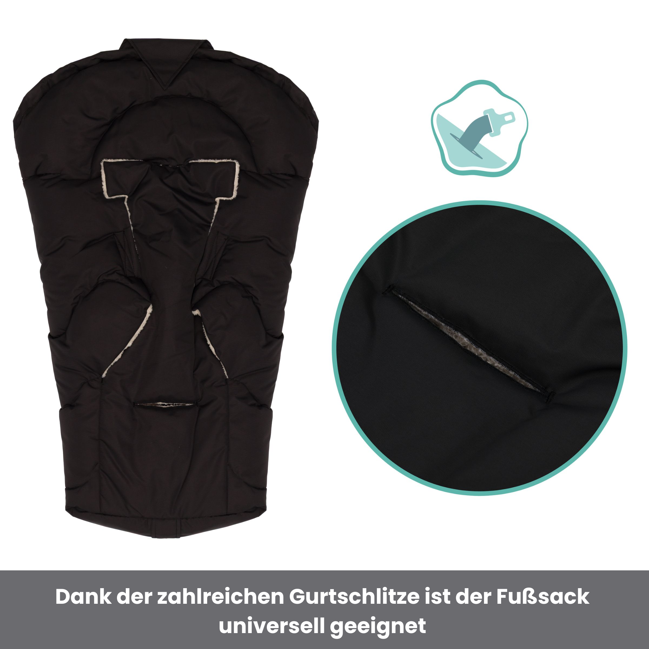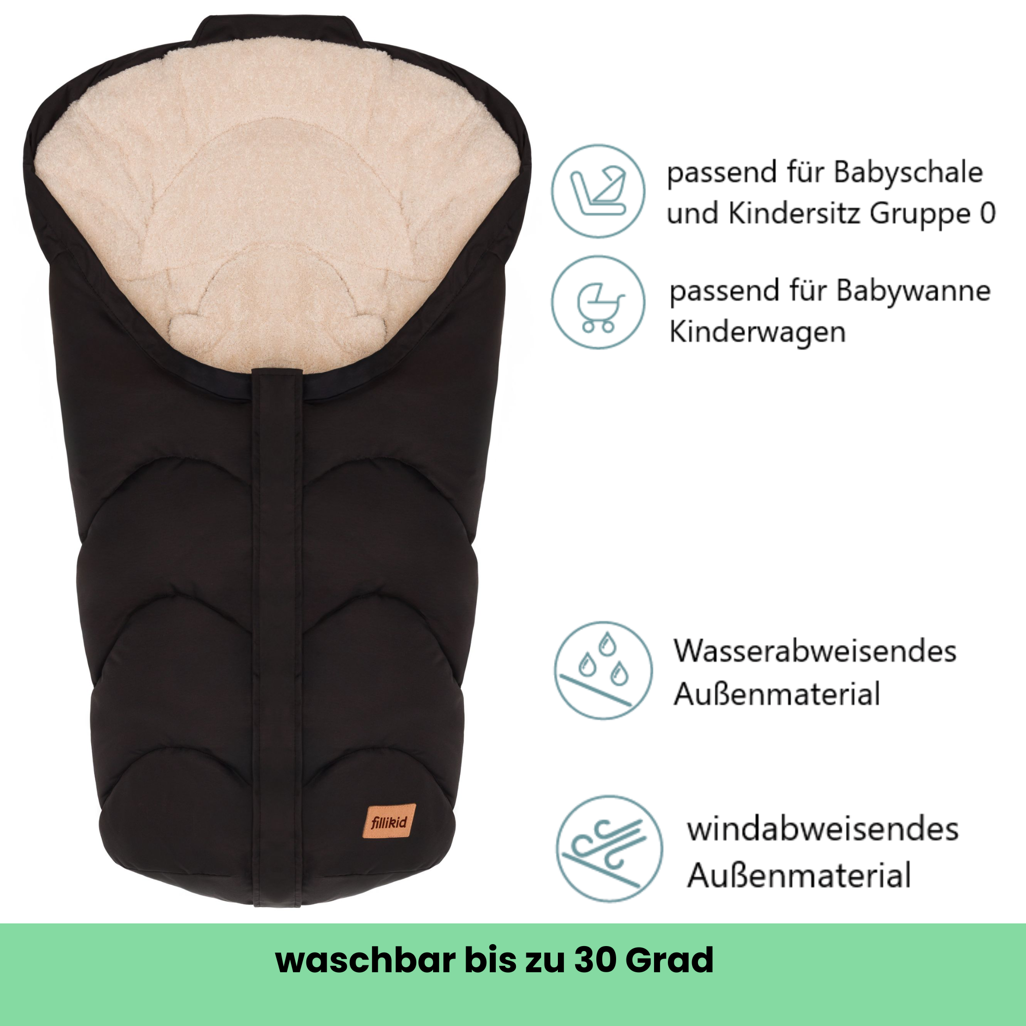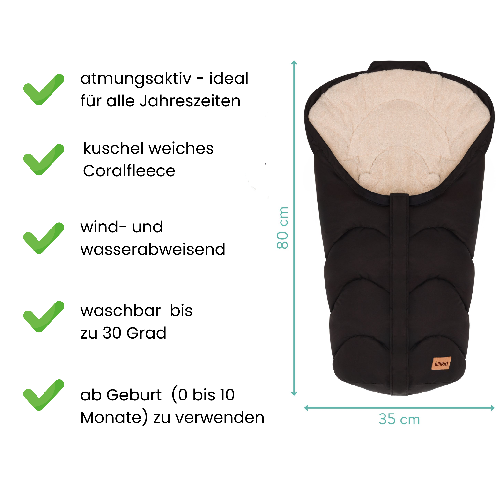 Der Fillikid Fusssäckchen Torre hält Ihr Baby zuverlässig warm – ob im Autositz der Gruppe 0 oder im Kinderwagen. Innen sorgt weiches Teddyplüsch für Geborgenheit, während das winddichte und wasserabweisende Aussenmaterial aus Polyester optimalen Schutz bietet. Für zusätzliche Sicherheit ist der Fusssack mit Gurtschlitzen für 3‑ und 5‑Punkt-Gurtsysteme ausgestattet – ideal für flexible Einsätze bei jeder Witterung. Der Fillikid Torre Fusssack eignet sich für Autositze der Gruppe 0 sowie für den Einsatz im Kinderwagen. Aussen schützt wasserabweisendes Polyester vor Wind und Feuchtigkeit, innen wärmt weiches Teddyplüsch angenehm. Der Fusssack ist so konzipiert, dass er sich leicht mit 3‑ oder 5‑Punkt-Gurten befestigen lässt und nicht verrutscht. Mit kompakten Massen von ca. 35 × 80 cm ist er bequem zu handhaben und ideal für den mobilen Alltag mit Baby.