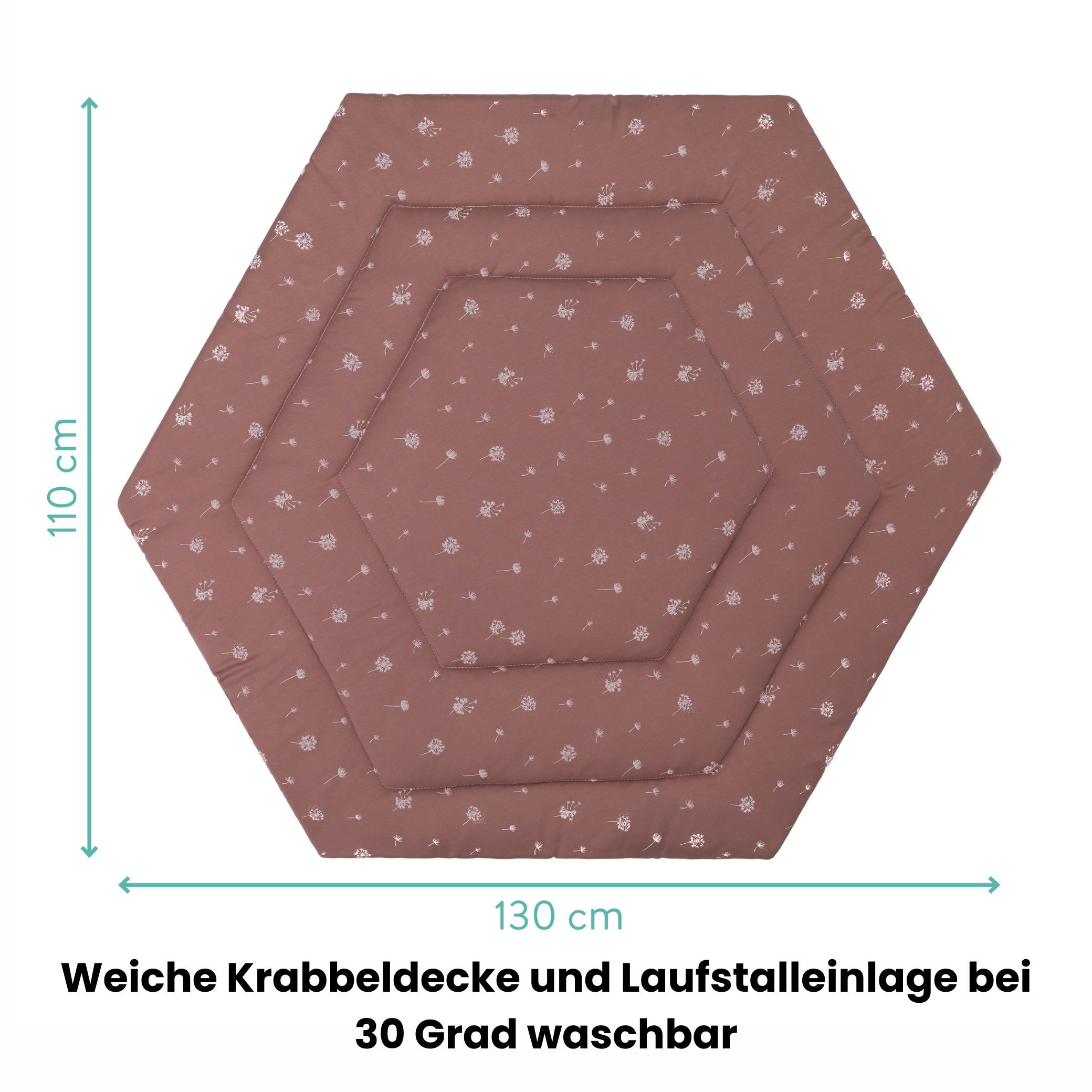 Dein Engel spielt sehr gerne und häufig im Laufstall? Dann Ist diese Einlage genau das Richtige für euch. Sie polstert den Boden perfekt und schützt vor dem kalten, harten Boden. So kann das Kleine herumtollen, ohne sich zu verletzen, da die Laufstalleinlage mit extra weichem Polyester gefüttert ist. Sie passt perfekt in unser 6-eckiges Laufgitter, aber natürlich kann die Einlage aber auch als praktische Krabbeldecke oder Spieledecke verwendet werden. Und durch den tollen Bezug aus Jersey mit aufregenden Mustern spielt dein Liebling gleich noch lieber in seinem kleinen Reich.