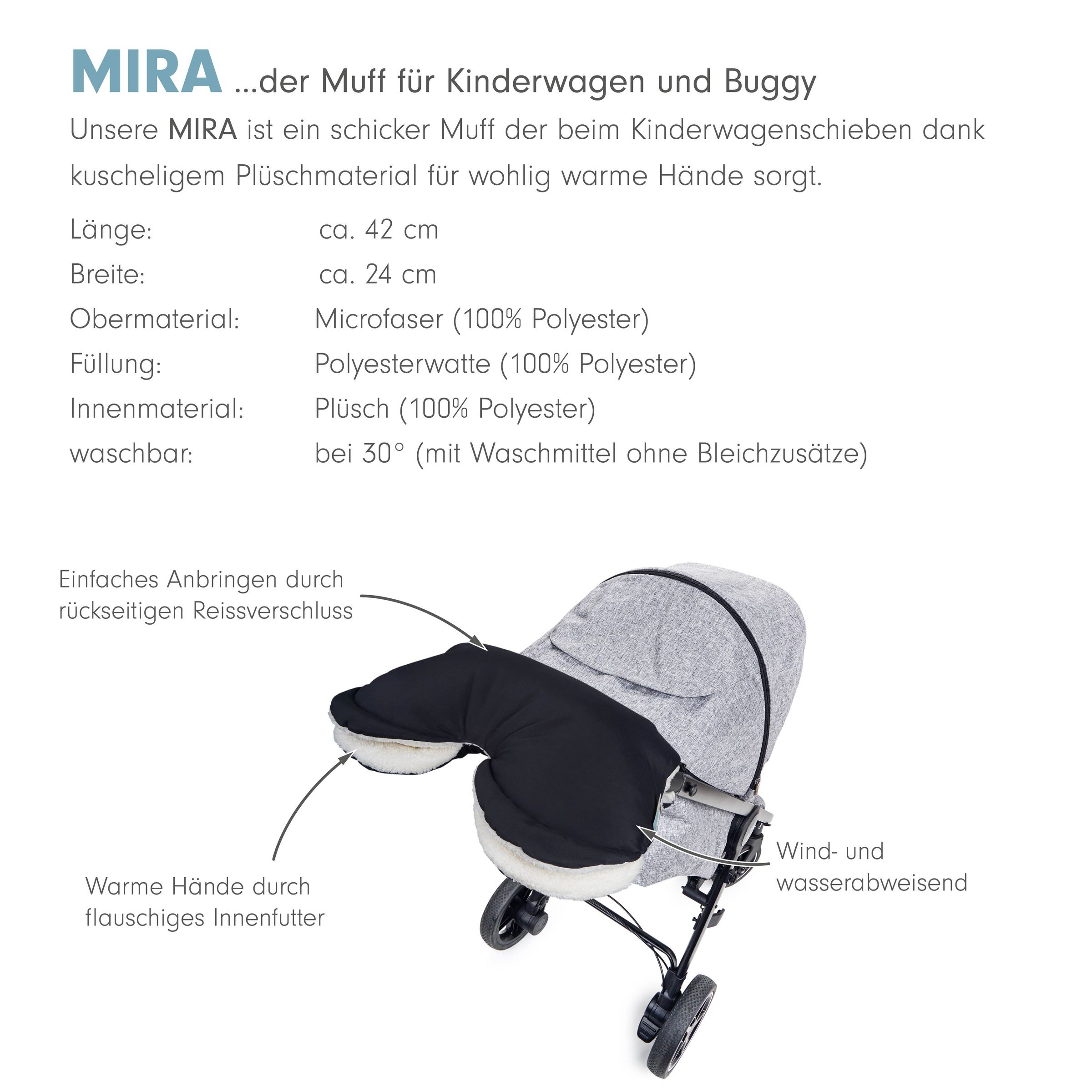 MIRA ist ein schicker Muff, der beim Spaziergang mit dem Kinderwagen für wohlig warme Hände sorgt dank kuscheligem Plüschmaterial. Verabschiedet euch von kalten Händen bei Wind und Wetter! Mit unserem PREMIUM Handmuff werden eure Hände durch kuscheliges Teddyfell immer angenehm warm gehalten und ihr behaltet trotzdem die volle Kontrolle über euren Kinderwagen.
