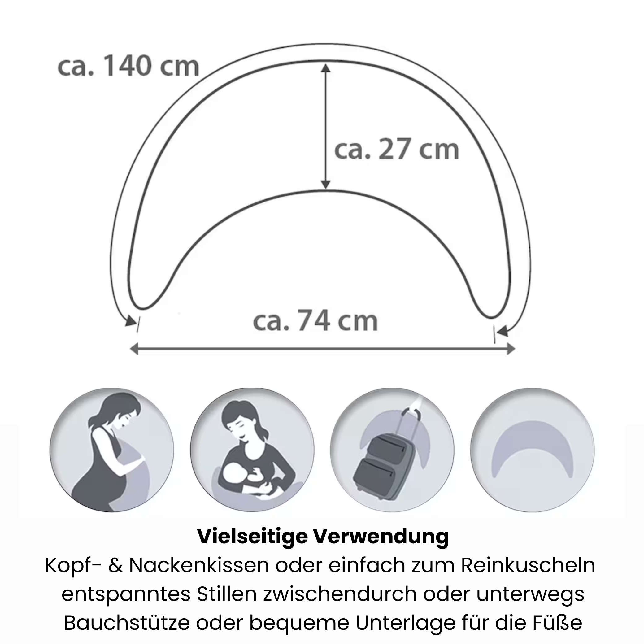 Das Theraline Musselinmond Stillkissen bietet nicht nur eine entspannte Stillzeit, sondern auch ein komfortables Kuschelerlebnis für den gesamten Körper. Mit seinem handlichen, praktischen Design lässt sich das Kissen nicht nur für das Stillen verwenden, sondern auch als gemütliches Kopf- und Nackenkissen oder als kuscheliges Lesekissen im Alltag. Der 4-lagige Musselinbezug fühlt sich besonders weich und angenehm auf der Haut an, während die feinsten Perlenfüllung aus Polystyrol eine perfekte Unterstützung und sanfte Polsterung garantiert. Der Bezug besteht zu 100 % aus Baumwolle und ist somit nicht nur strapazierfähig, sondern auch atmungsaktiv und hautfreundlich. Das Inlett des Kissens ist ebenfalls aus Baumwolle gefertigt und sorgt dafür, dass das Kissen stets in Form bleibt. Besonders hervorzuheben ist, dass das Theraline Musselinmond Stillkissen geruchs- und schadstofffrei ist. Mit einem Außenmaß von 140 x 27 cm und einer Füllmenge von etwa 18 Litern ist das Kissen großzügig dimensioniert und bietet ausreichend Komfort und Flexibilität. Ob für entspannte Momente mit Ihrem Baby oder als praktisches Stützkissen im Alltag – das Theraline Musselinmond Stillkissen vereint Funktionalität und Komfort in einem stilvollen Design und wird schnell zu Ihrem neuen Lieblingsbegleiter.
