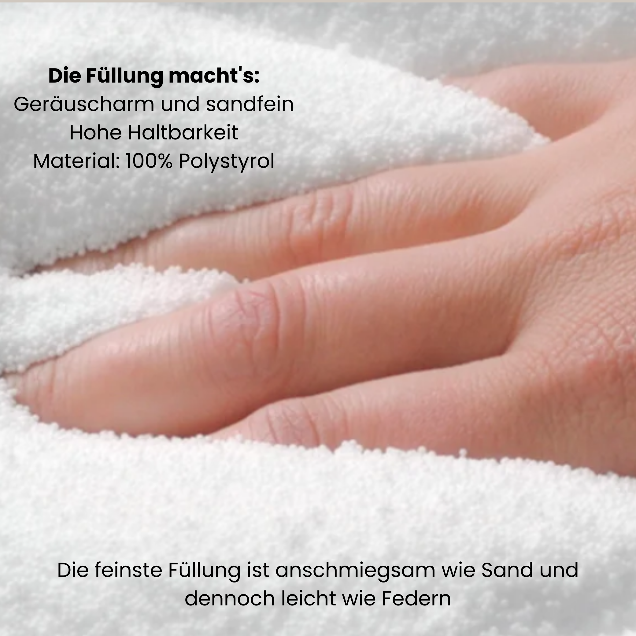 - Füllung: Feinste Polystyrol-Perlen (ca. 18 Liter, 25 g/l)